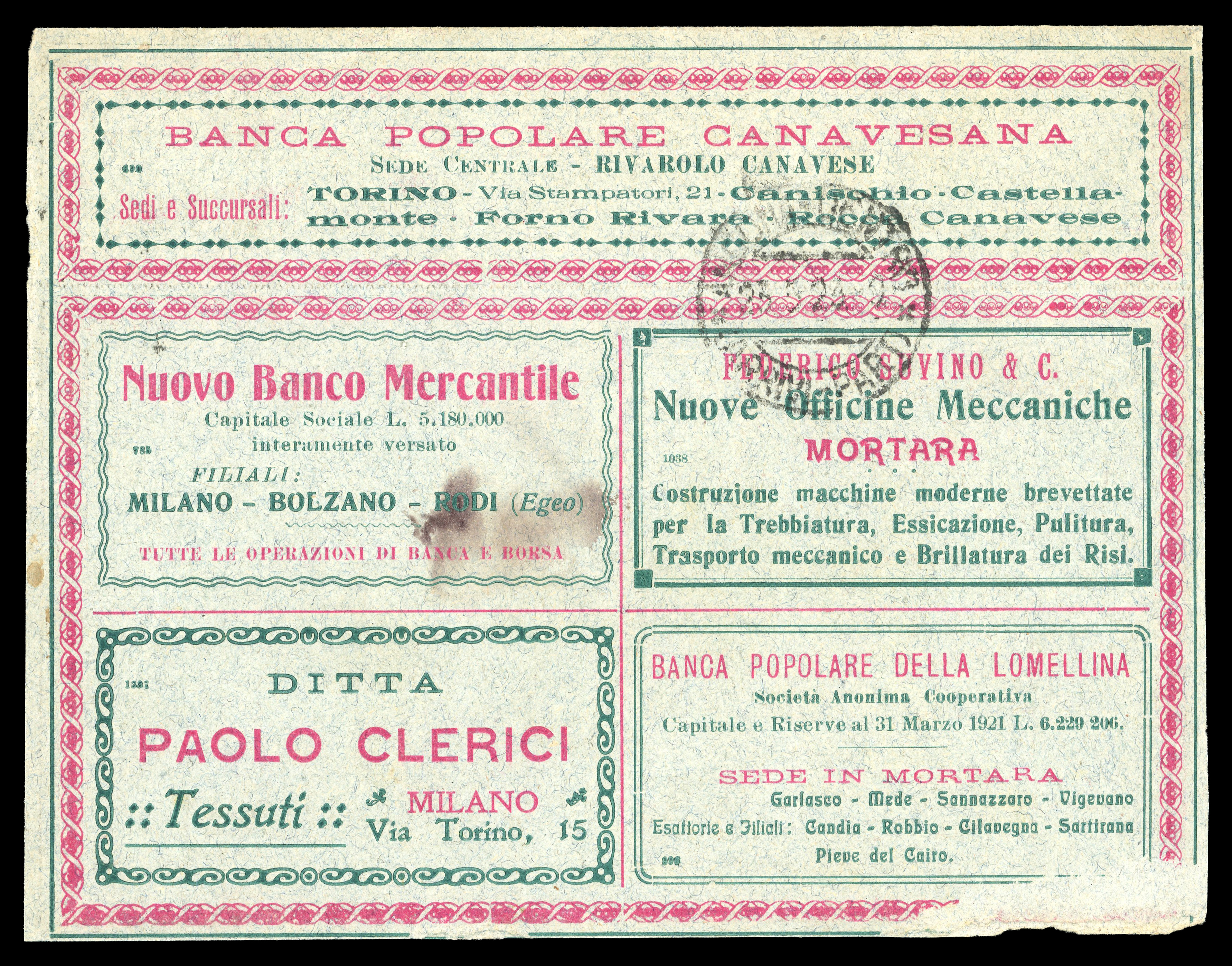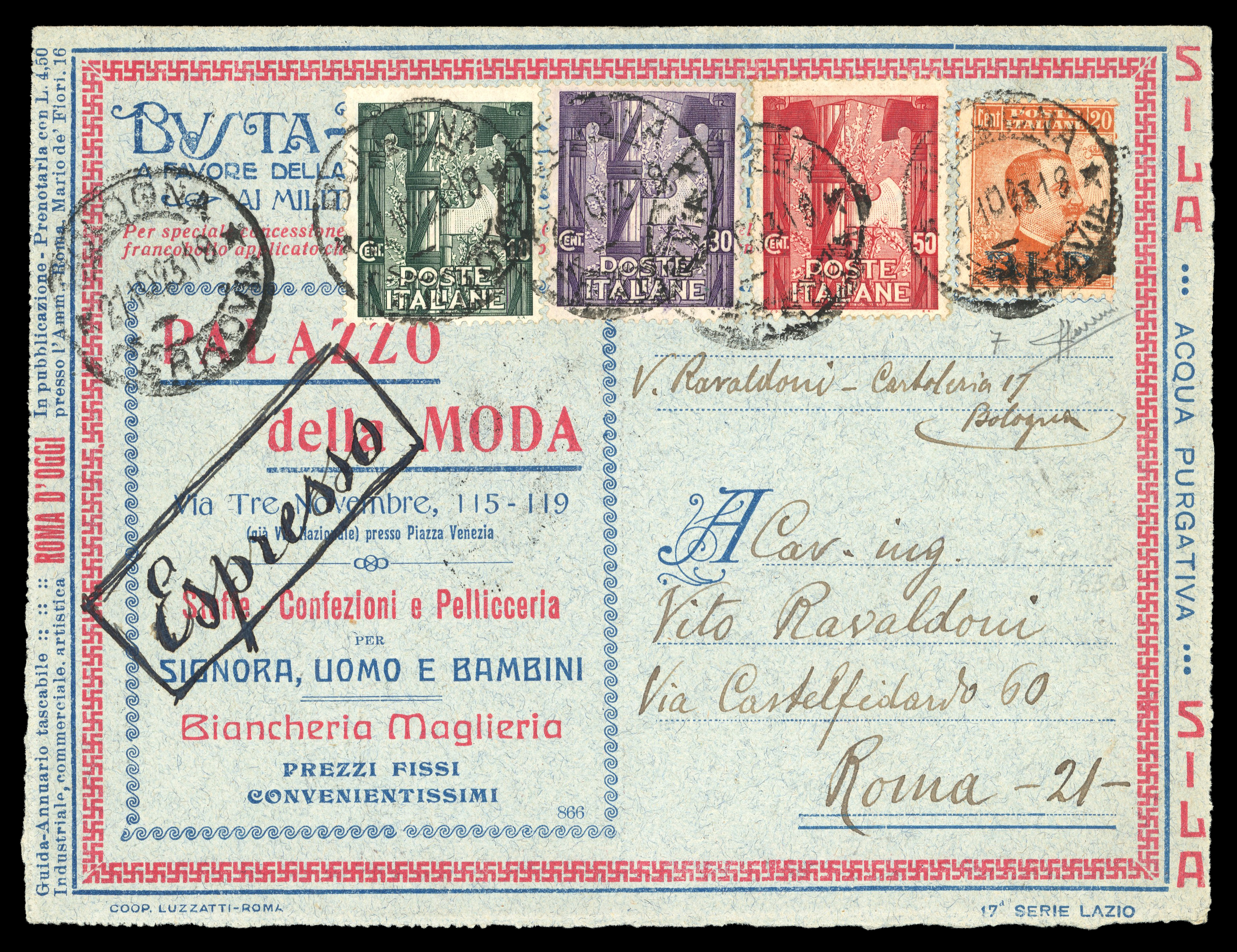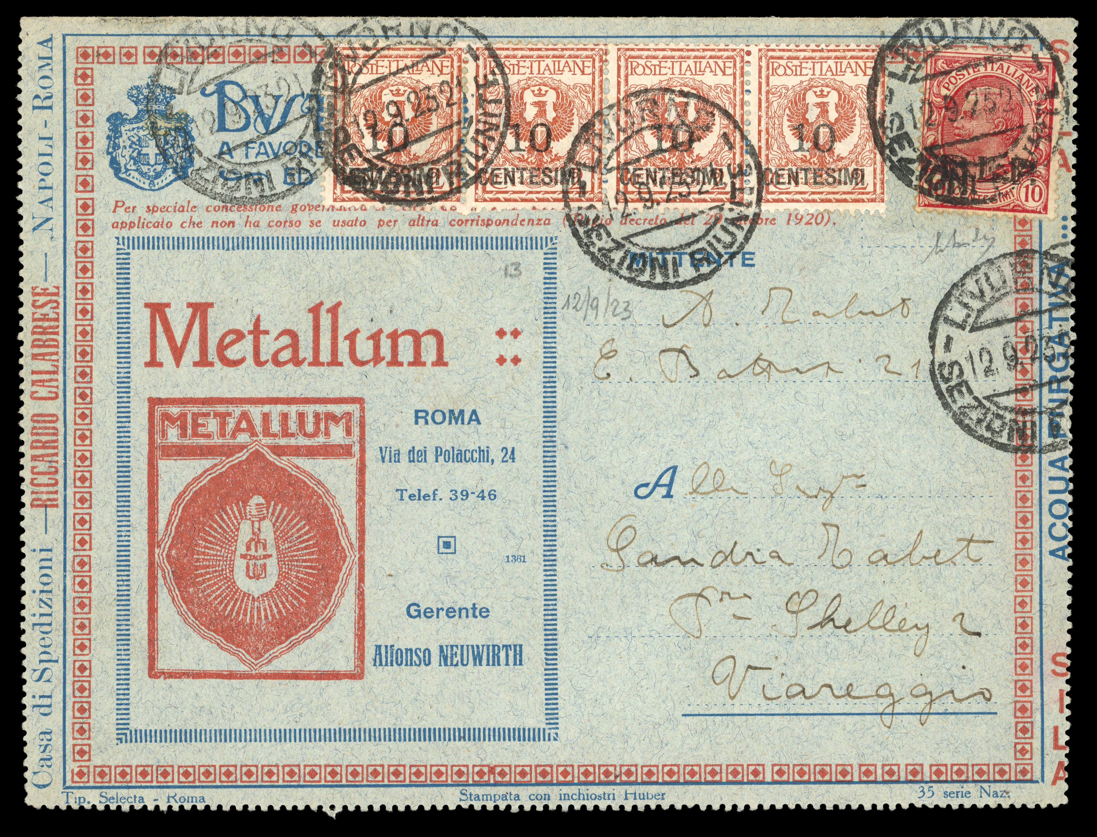 1922-23 "B.L.P." (Busta Lettera Postale = Postal Publicity Stamp) overprint on 40c stamp (13½mm opt. in litho, dark blue) unused on complete lettercard. Generally good condition, but just very slight ageing/touches of toning. Stamp itself