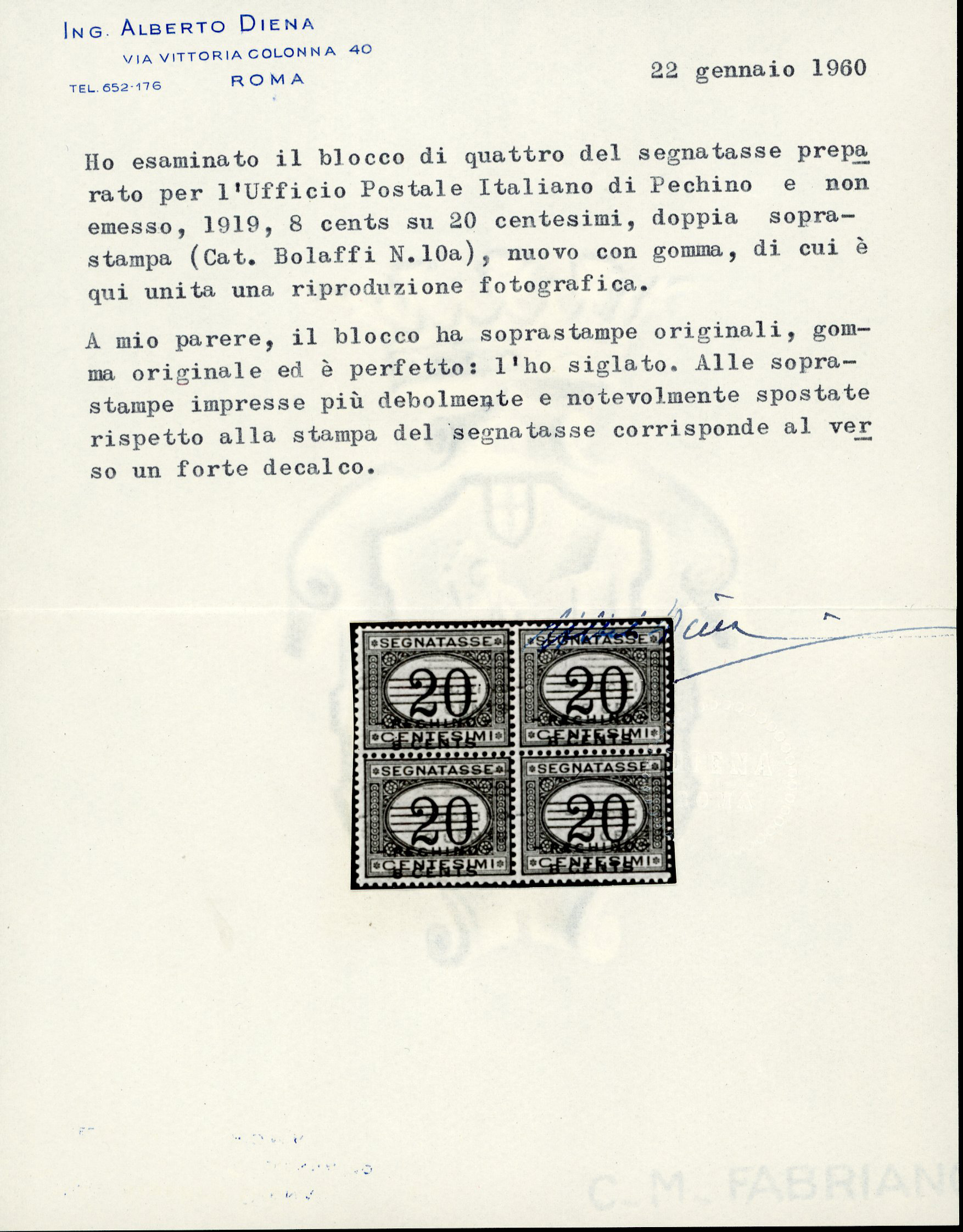 1919, Italy China PECHINO postage due stamp 20c with double overprint "PECHINO 8 CENTS" mint never hinged in block of 4 (Sassone 12'000€). Very rare and extremely fresh ! Signed Diena and certificate (1960). (Image 1)
