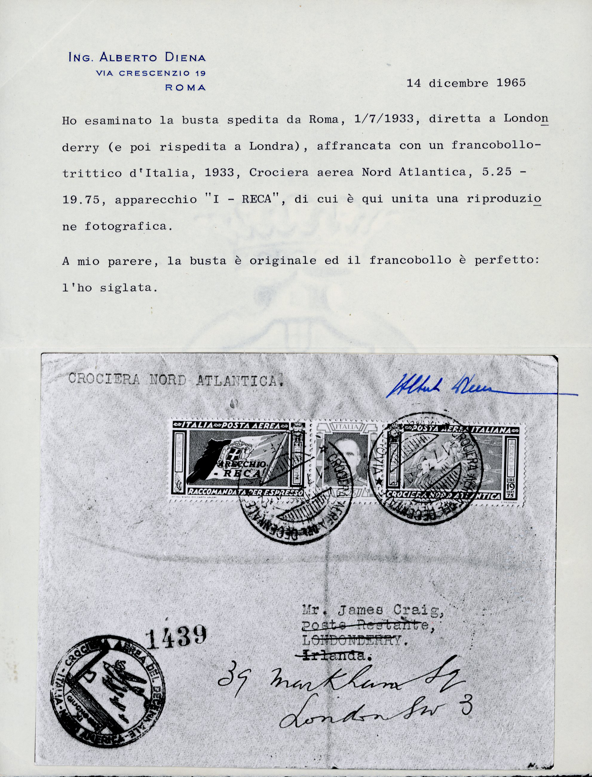 1933 (Jul 1) "supplementary flight" airmail cover sent from Rome to Ireland (and then forwarded to London), franked with an 1933 North Atlantic triptych "I RECA", arrival bs, fine, a rare flight and destination with only 15 covers