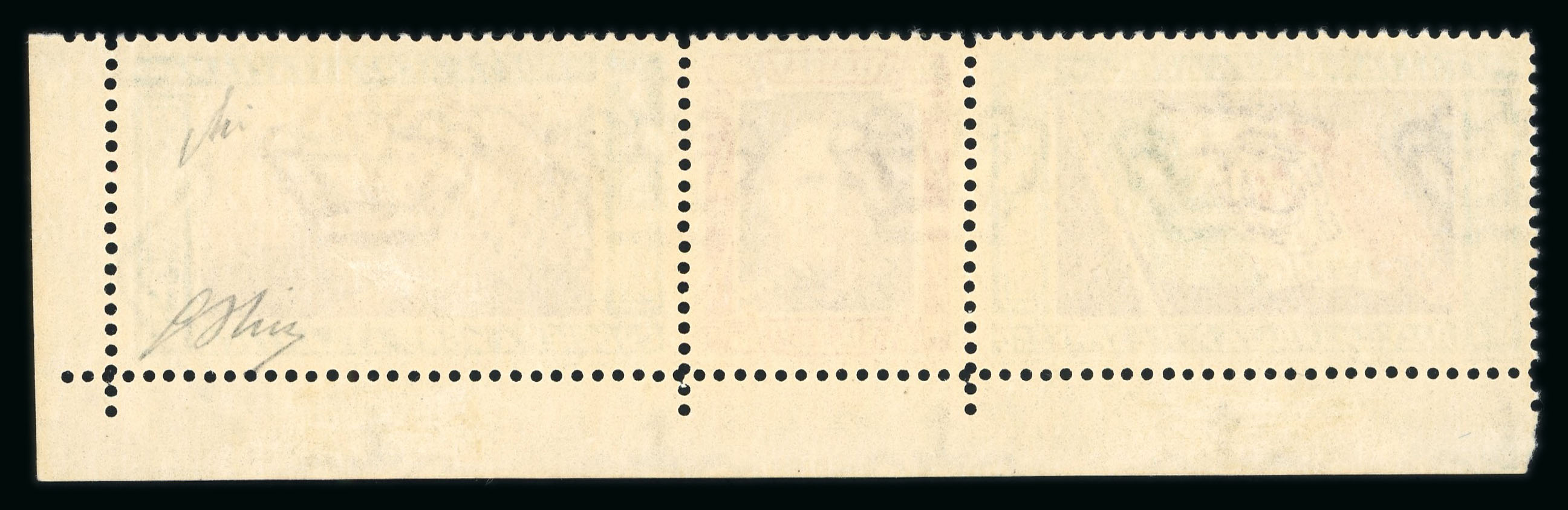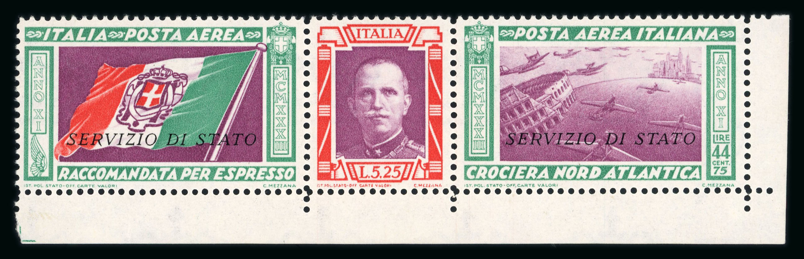 1933 North Atlantic Cruise air service stamp in triptych 5.25 + 44.75 lire green, red and lilac, overprinted "State Service" with watermark letters showing on the right a complete letter "A" of the writing "POSTE ITALIANE" which is