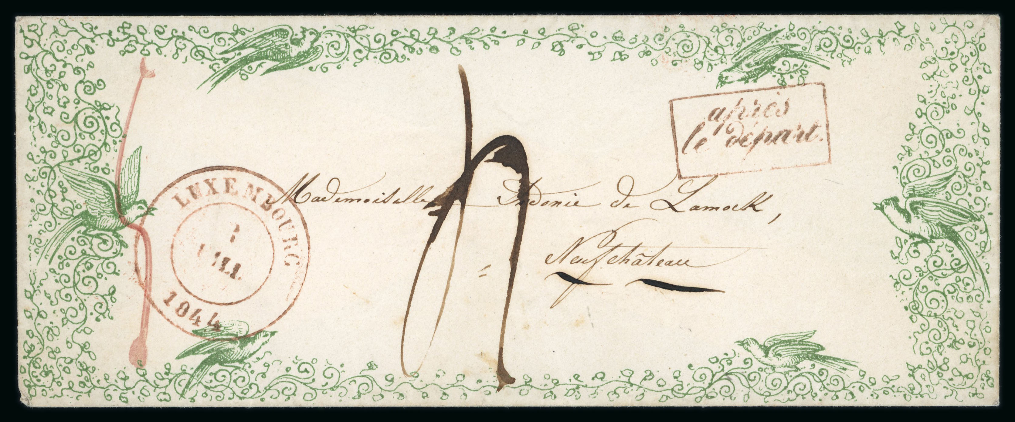 1844 (3 VIII) finely illustrated in green, ladies envelope to Neufchateau, Belgium cancelled bd by two-ring red Luxembourg date stamp, small neat framed handstamp in same ink 'apres/ le depart' to right, manuscript rate markings; a very