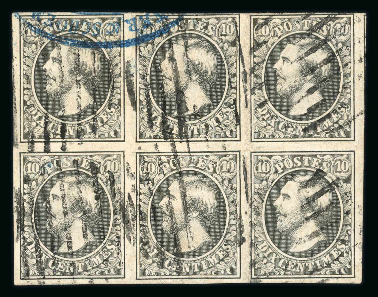 1853 Second printing 10c greenish black block of six (3 x 2) with nine bar cancels and part blue handstamp of 'Wagner & Schoemann' top left, probably the finest known, largest loose block.Acquired by Mauric Burrus at Kohler 15/12 1920