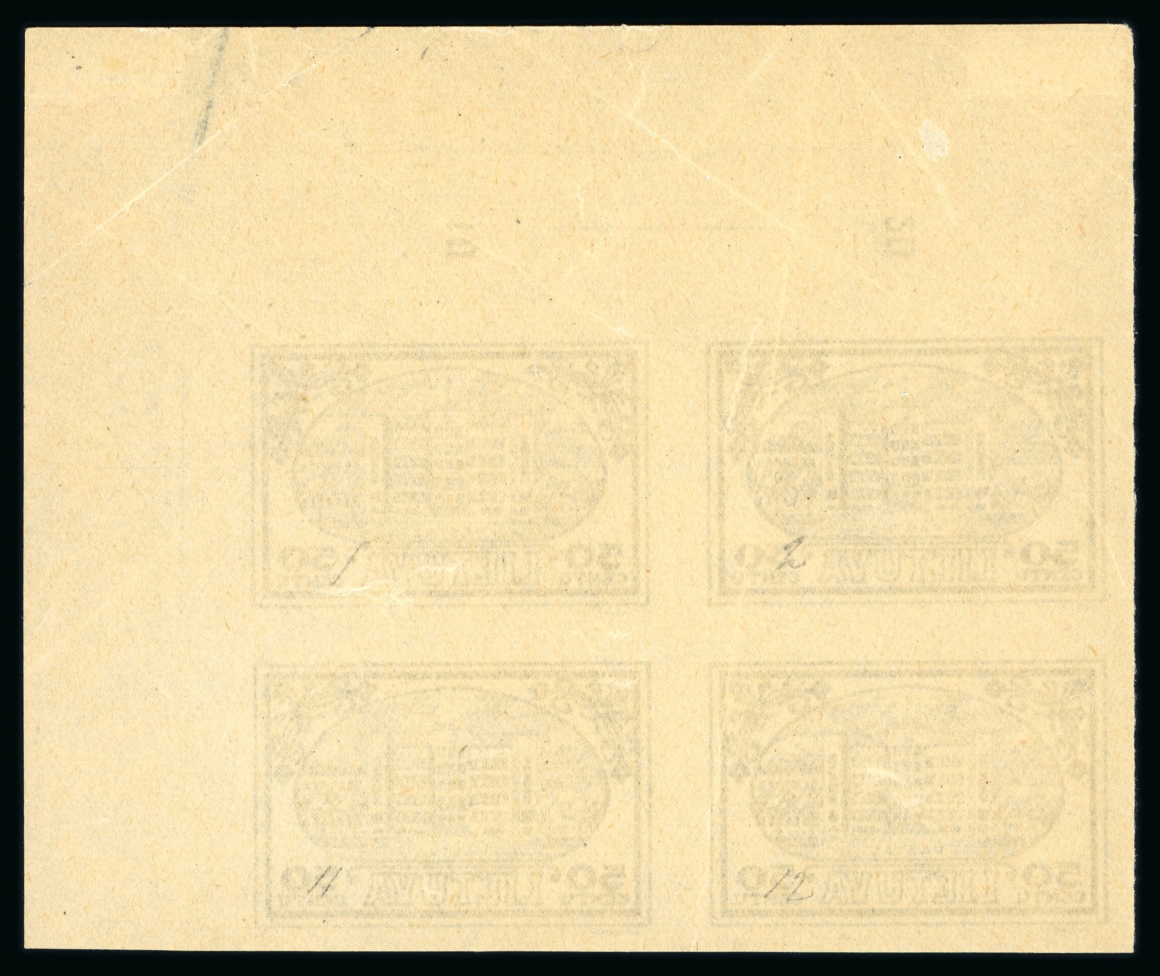 1932 50c Central Post Office, Kaunas in grey imperf corner marginal block of four, some very slight inconsequential gum creasing, fresh mint n.h., a rare and desirable multiple (Image 1)