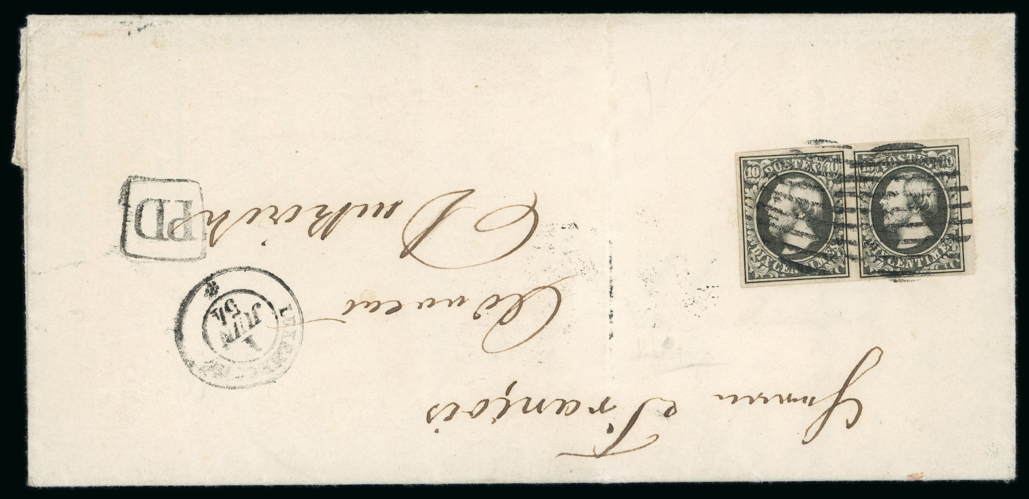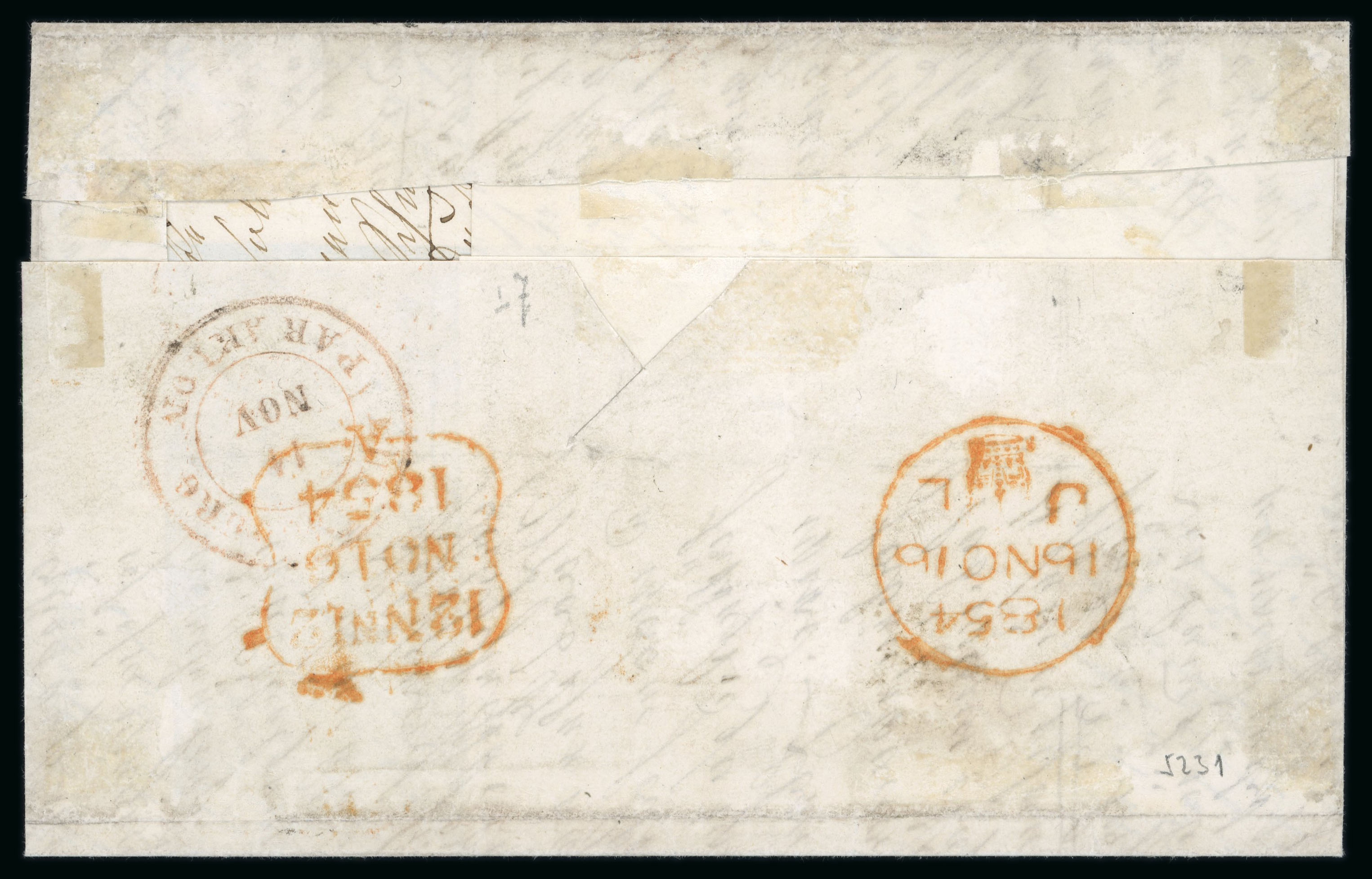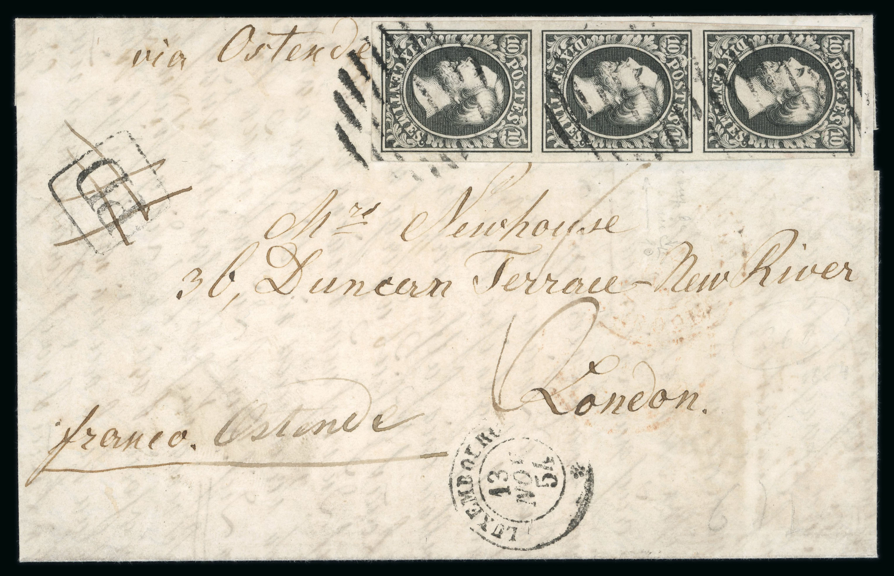 1854 (13 Nov) entire to London franked Second printing 10c greenish black in vertical strip of three, fine large margins all round tied by nine bar cancels, entire endorsed "via Ostende" at top and "franco Ostende" at base, cds at base