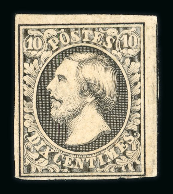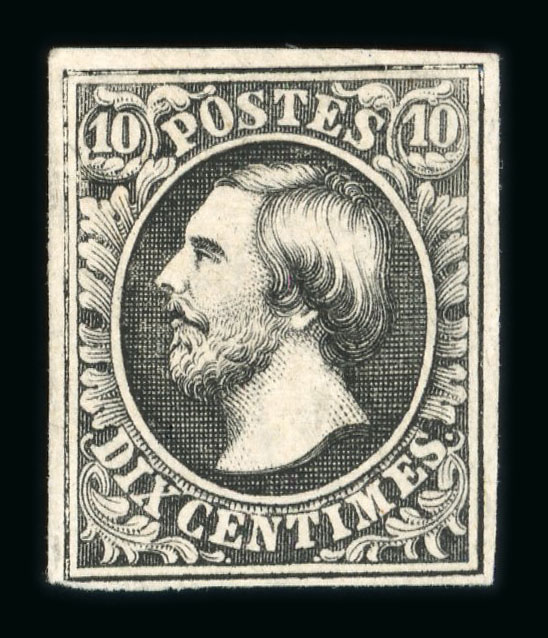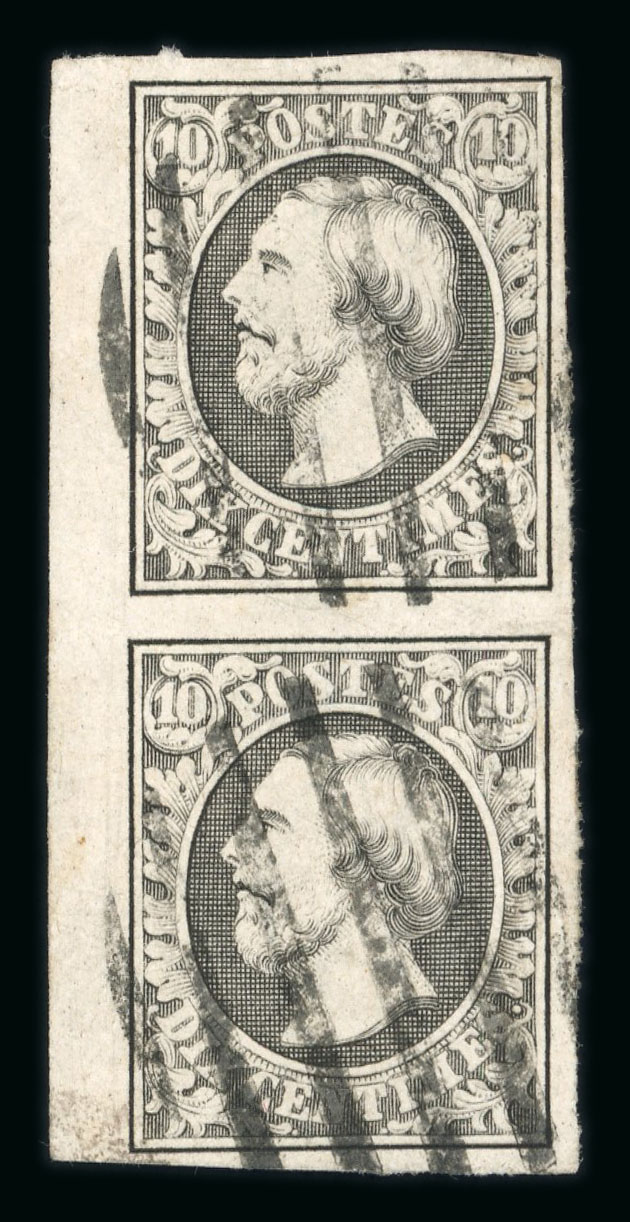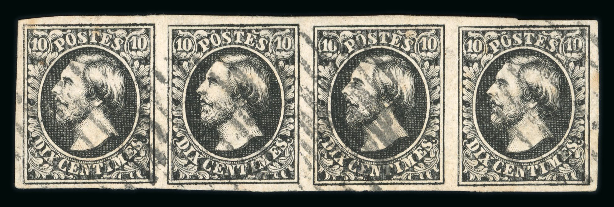 1854 10c velvet-black, Liez printing, inverted watermark horizontal strip of four with good to large margins all around, light nine bar cancels. In Goebel a premium of 2,500 Euro for a single, in Moniteur shown as 'Piece du Mois" (c'est