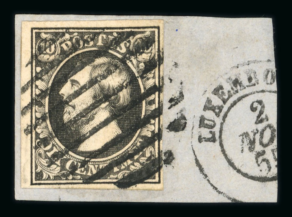 1854 4th Printing 10c velvet black, four good to large margins tied to small piece by virtually complete nine bar cancel and part Luxembourg 2 Nov 55 cds to right, signed Demuth BPP (Image 1)