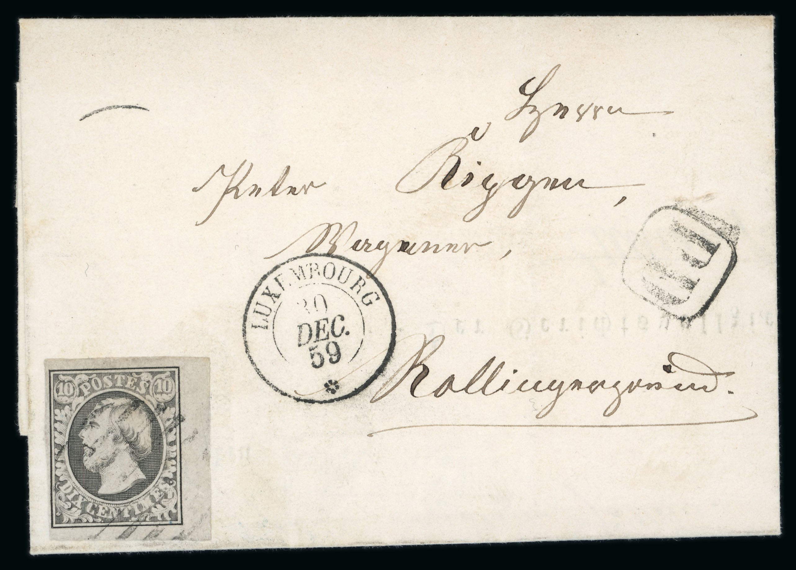 1859 (9 Avril) printed invoice franked last printing 10c., good even margins cancelled by nine bar grill, Luxembourg despatch at right below framed PD, arrival backstamp (Image 1)