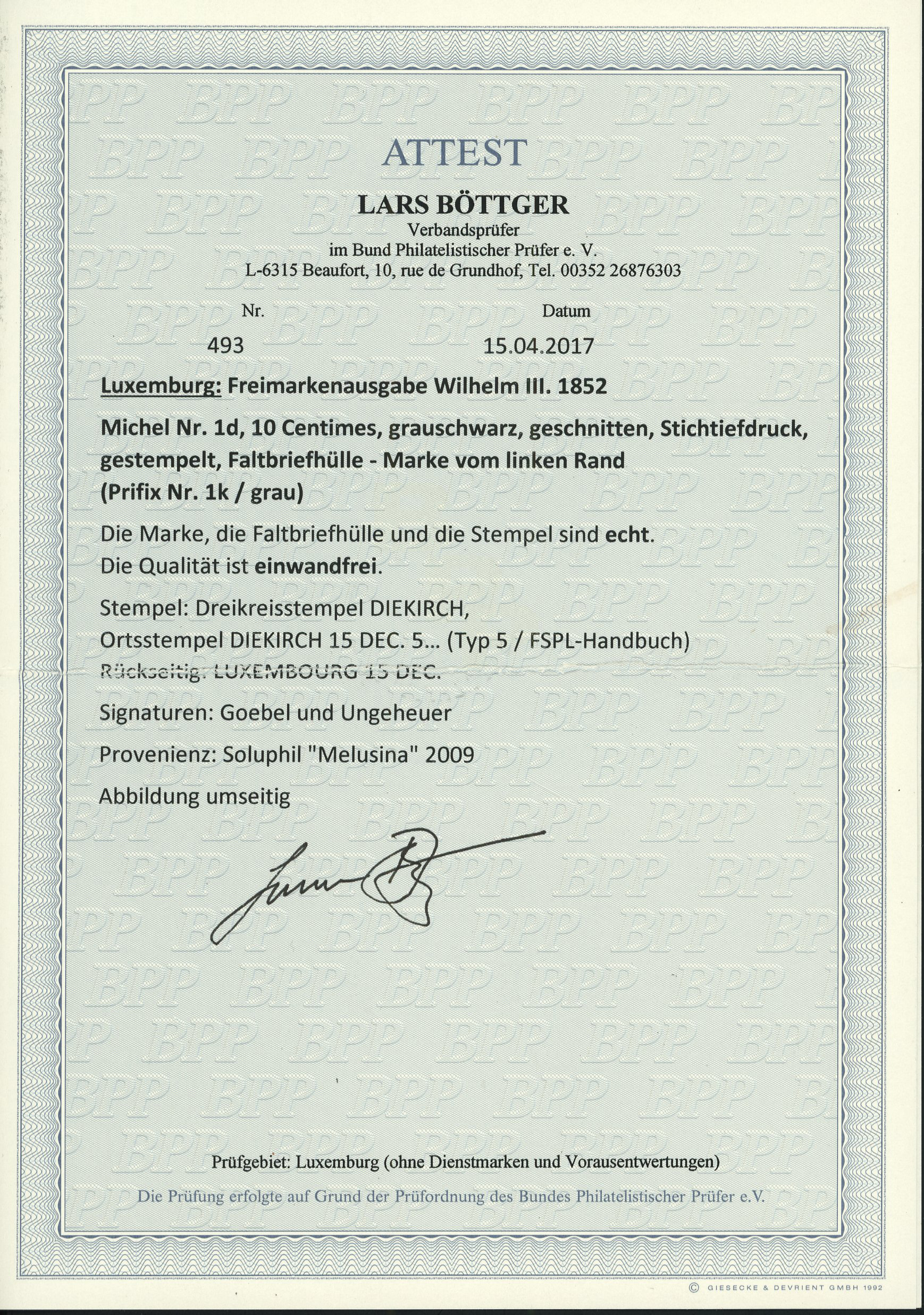 1858 Last Printing 10c grey left-hand marginal tied to outer letter sheet tied three-ring cancel of Diekirch. Ex Dierauer, signed Goebel and Ungeheur, Böttger Cert (2017) (Image 1)