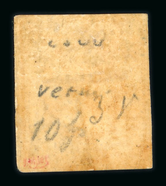 1852 First Printing 1Sgr blood-red, four margins fresh used with part three-ring cancellation, R.Goebel Cert (2003). (Image 1)