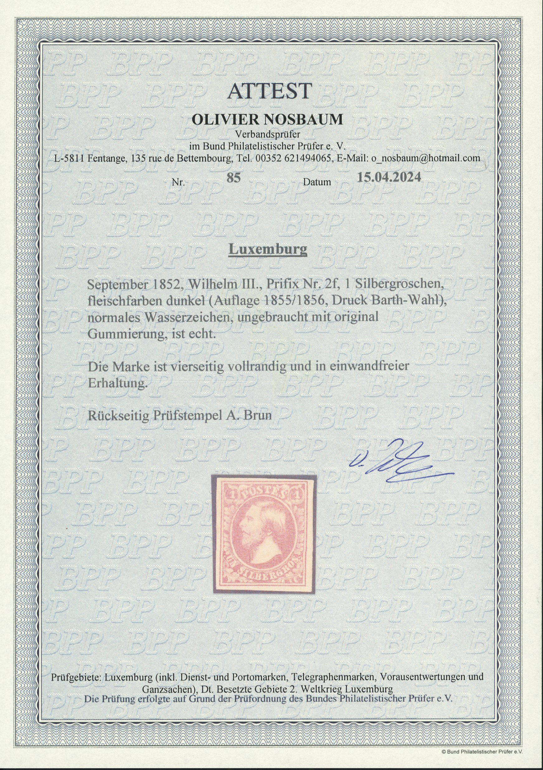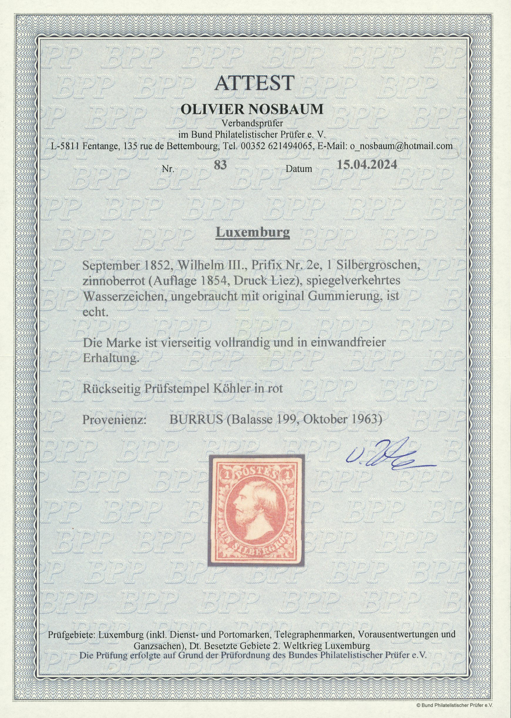 1854 2nd Printing 1 Sgr. red-orange, Liez printing with reversed watermark, four good to close margins, mint with original gum. Ex Burrus, W Balasse Cert (1963) and Nosbaum Cert (2024). (Image 1)