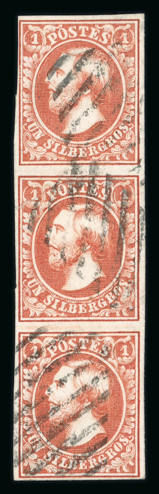 1854 third Printing 1Sgr red-orange vertical strip of three, top stamp with touched margin and close at base, very fresh used, normal watermarks are scarcer. (Image 1)