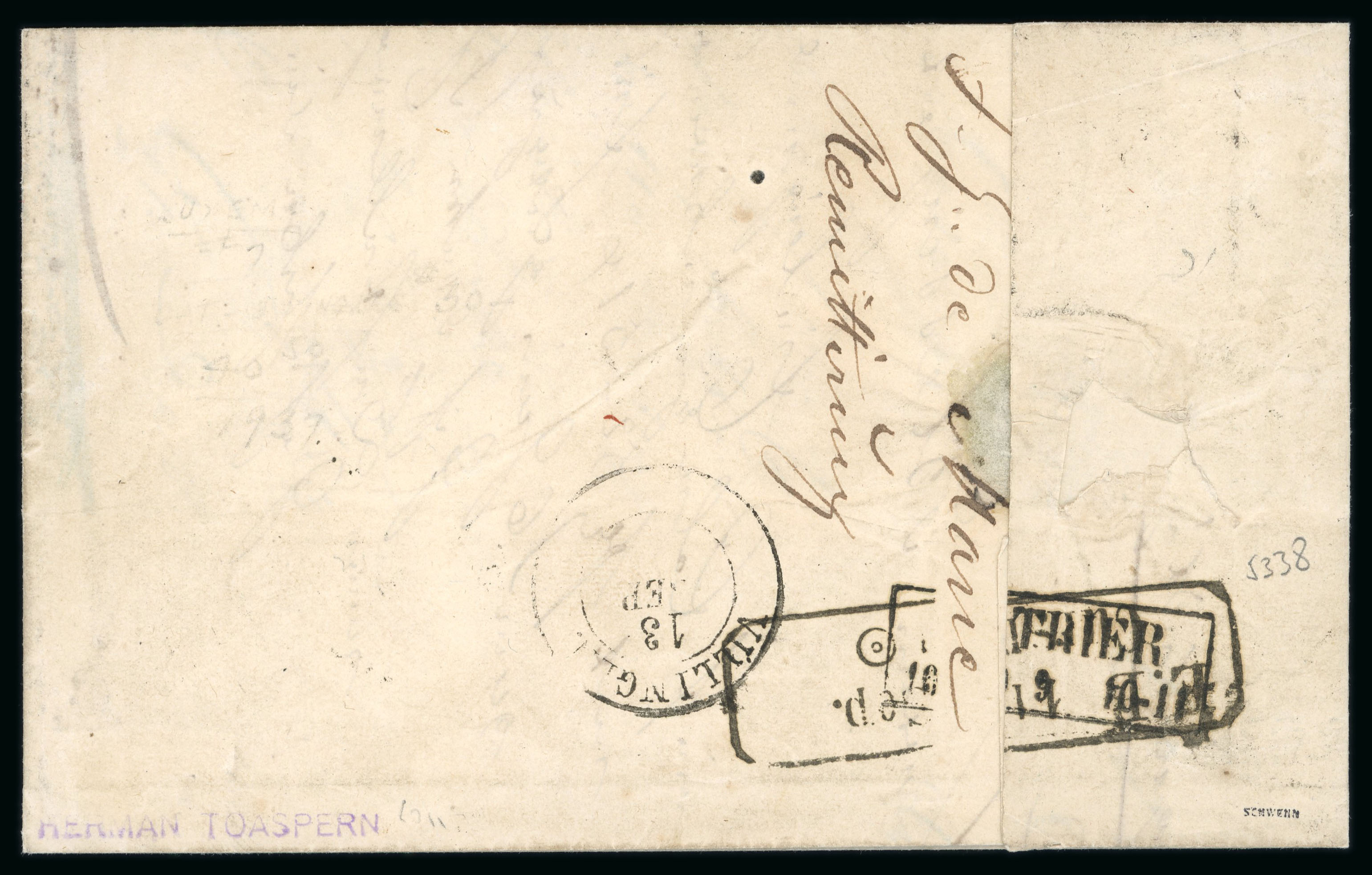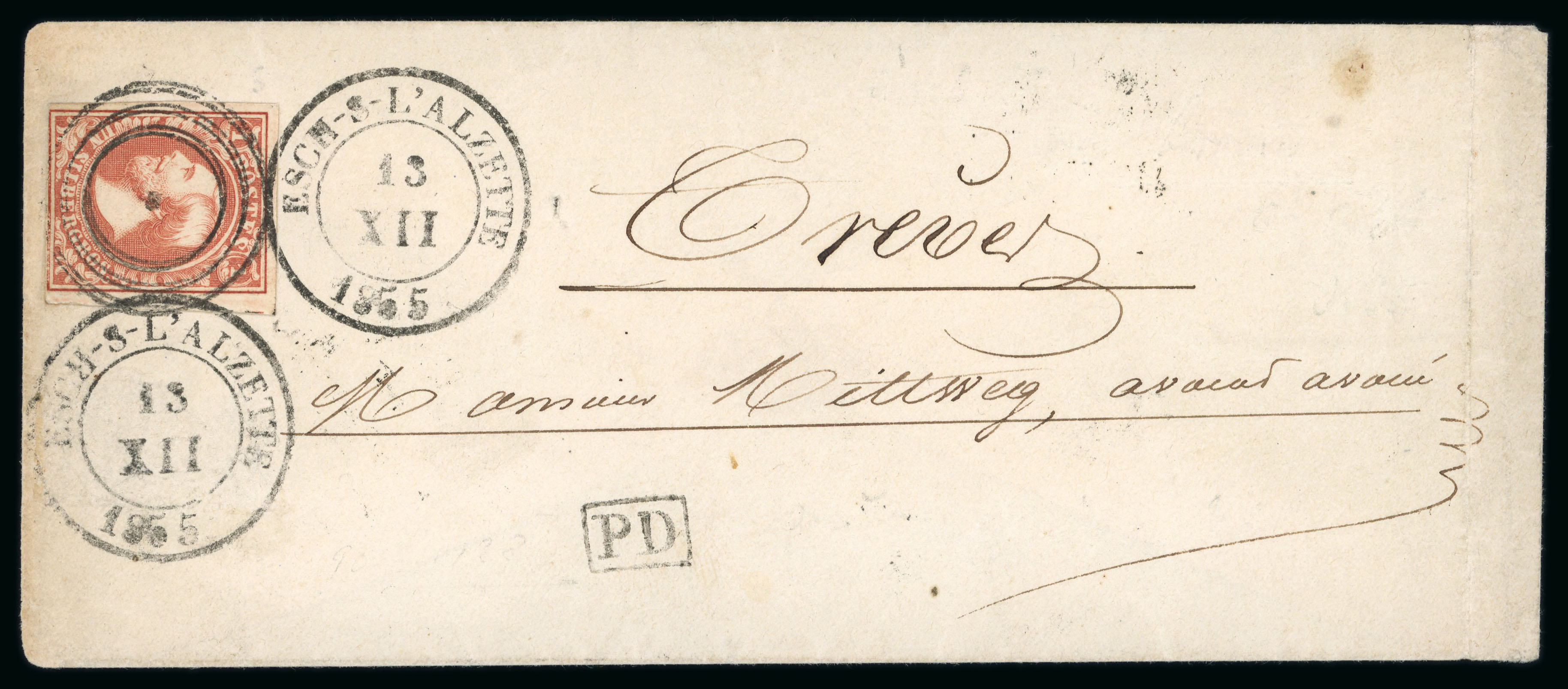 1855 (13 XII) envelope to Trier franked 1Sgr, three good to large margins, just touched at base tied three-ring handstamp and two Esch-S-L'Alzette date stamps, the only known 1Sgr cover from this town, the key item in the Staar