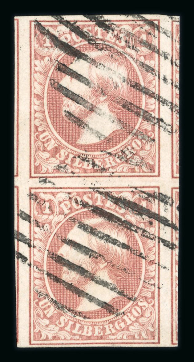 1854 1Sgr brownish red, four close to good margins cancelled by full framed small PD; one of the most attractive examples of this stamp (Image 1)