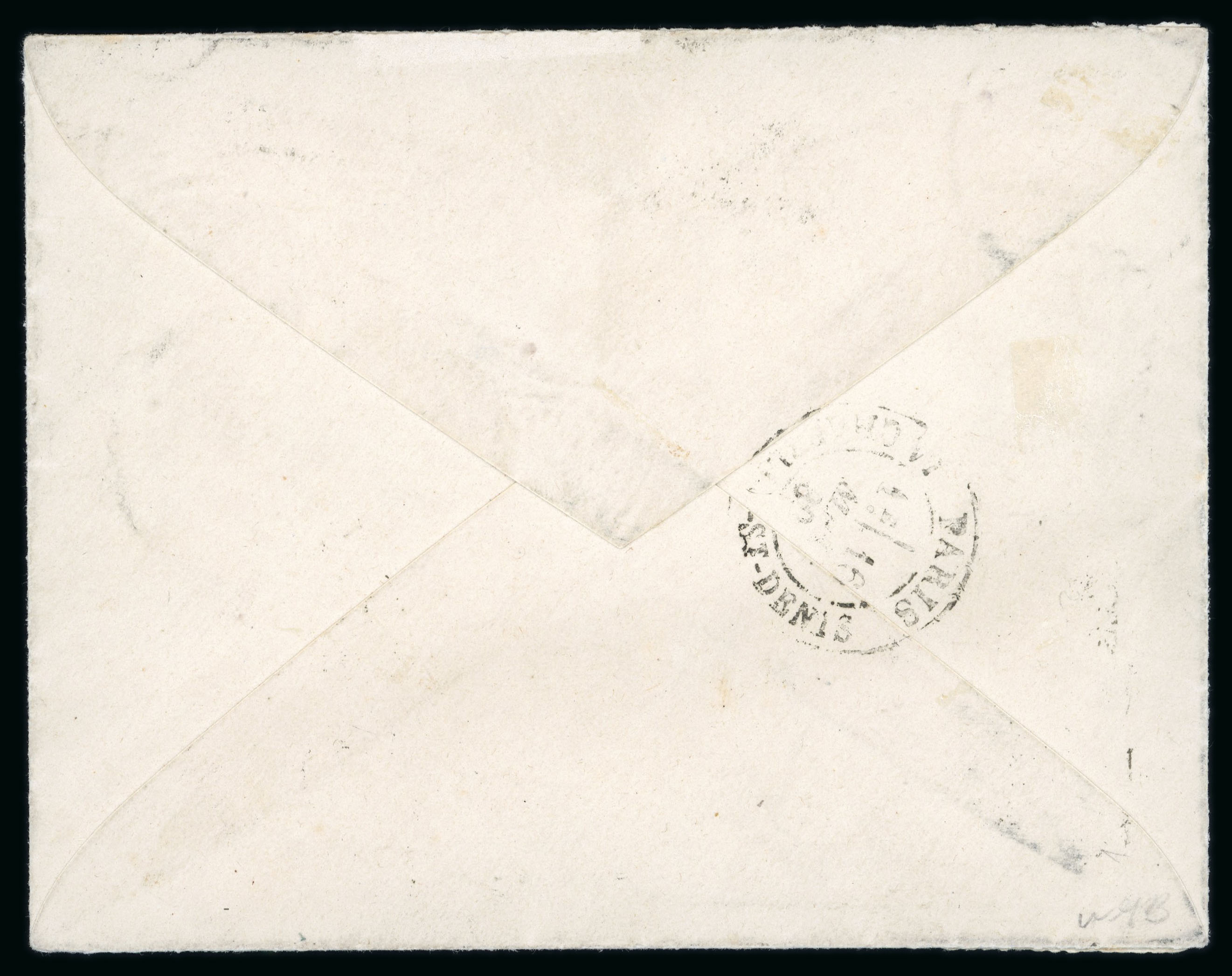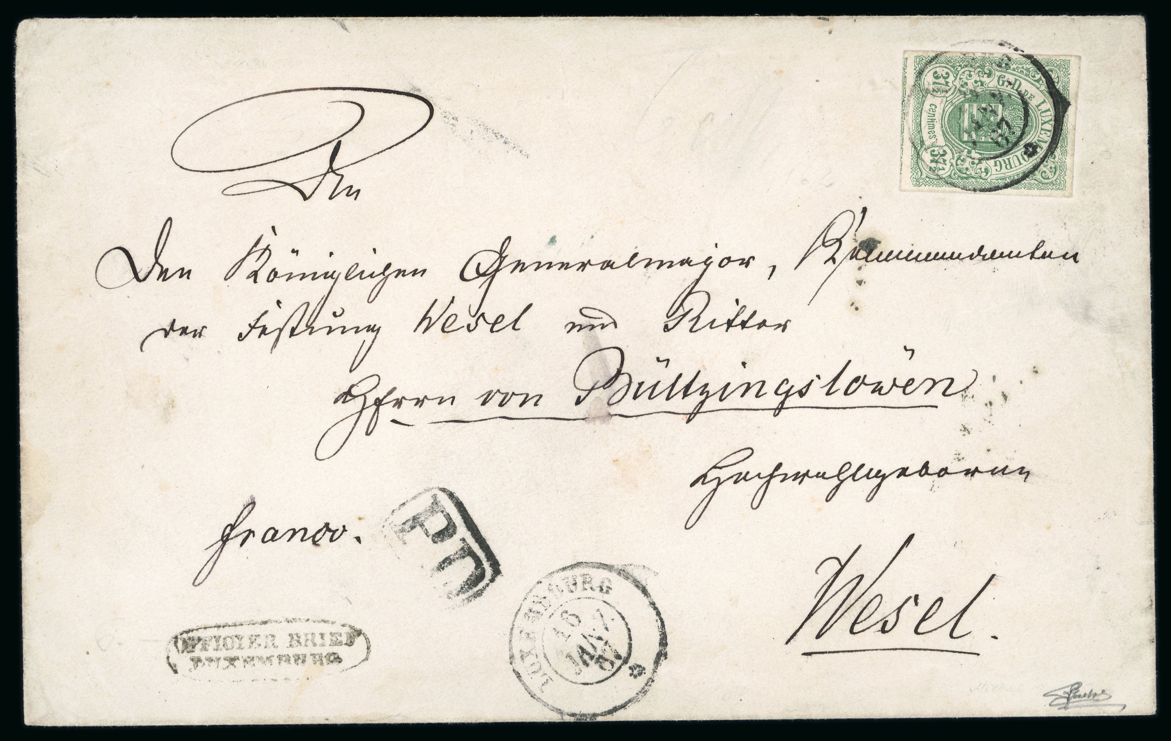1859 37 1/2c Green with large to enormous margins showing portion of adjoining stamp at foot, tied by Luxembourg cds to 1867 (Jan 16) envelope from the Prussian garrison in the fortress at Luxembourg to Wesel in Germany (17.1), showing