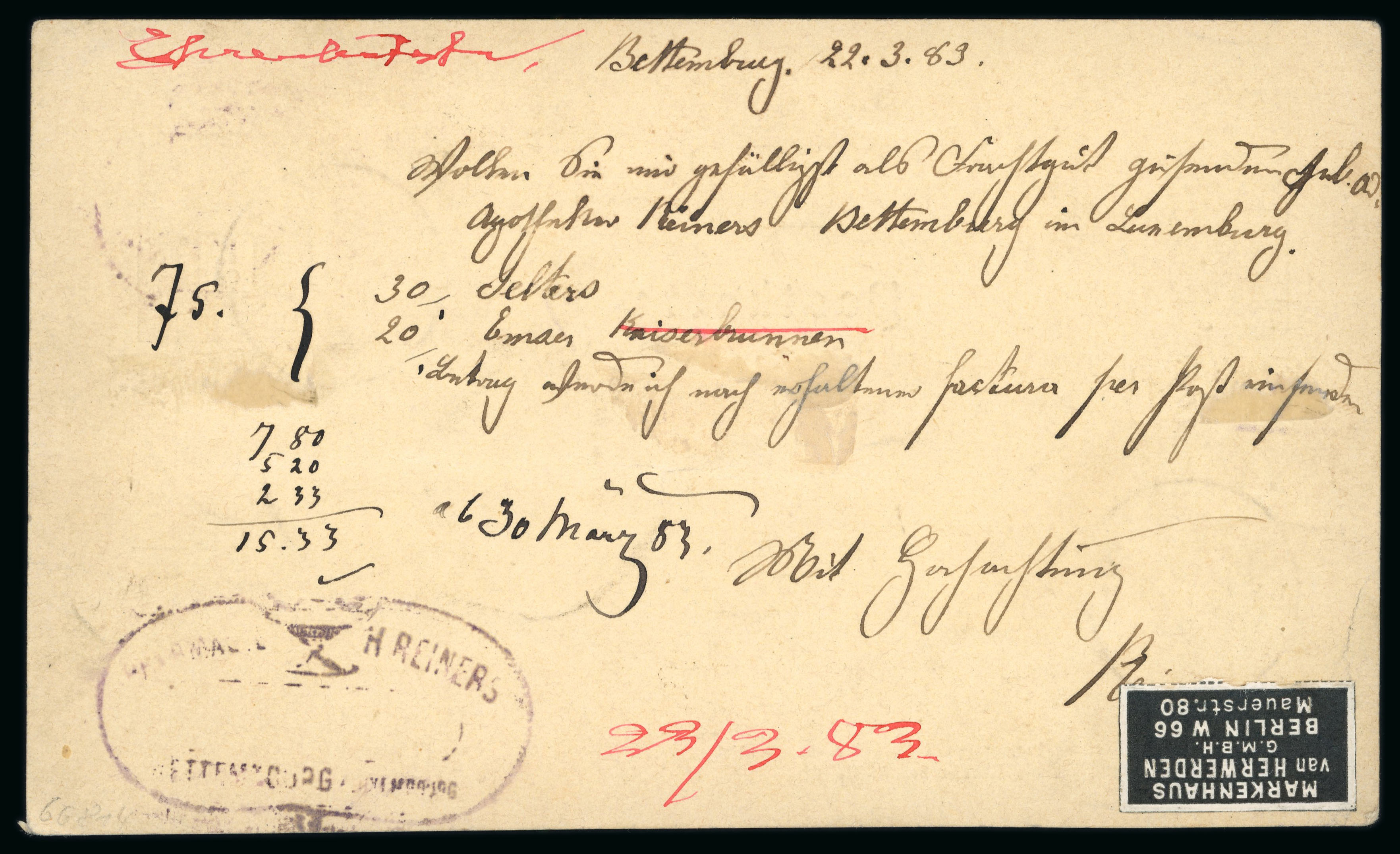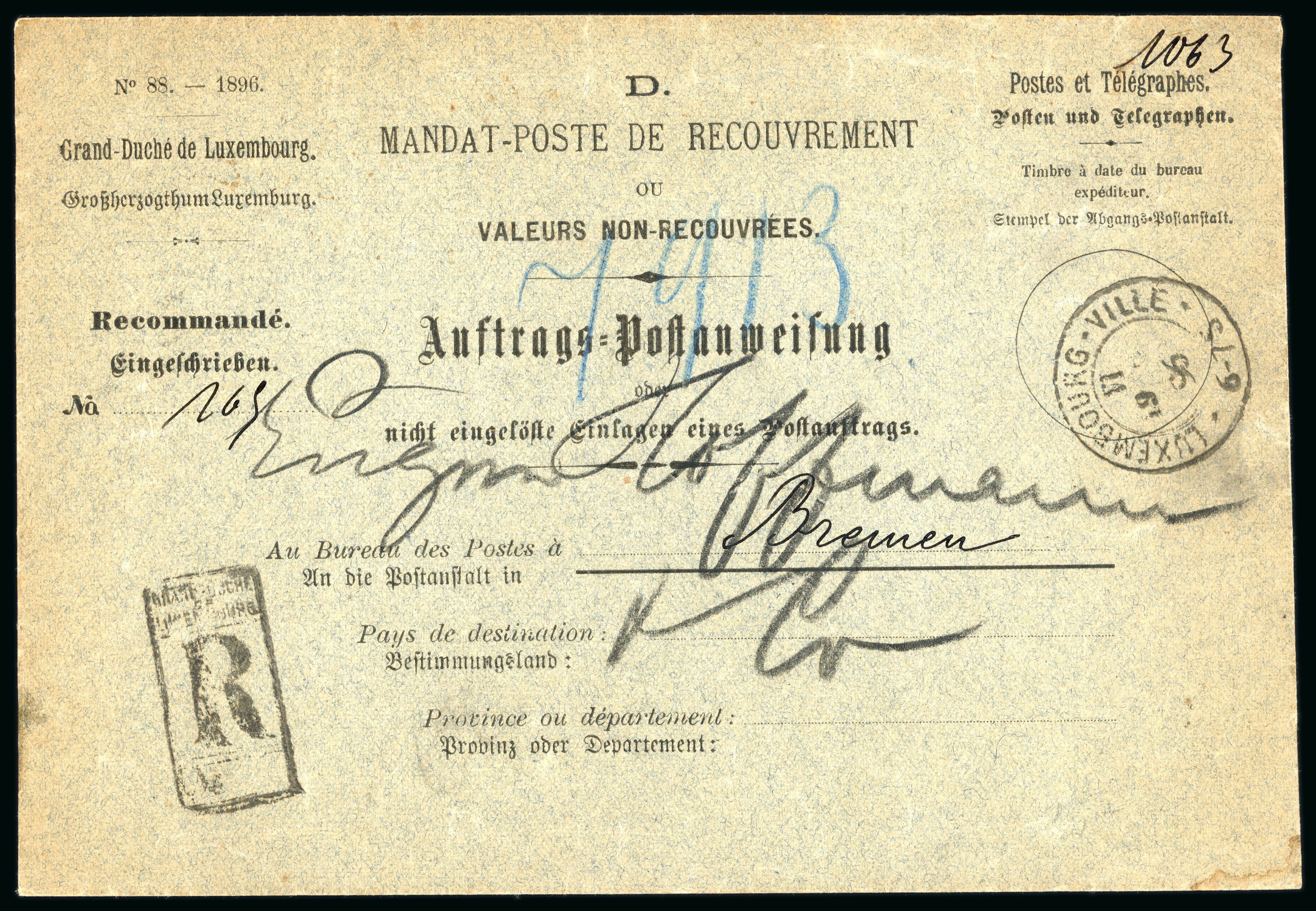 1896 Mandat-Poste De Recouvrement/ ou/ Valeurs Non-Recouvrees printed stampless envelope sent registered to Bremen with Luxembourg-Ville cds, reverse with Bremen arrival cds and Kaiserliches Postamt Bremen i wafer seal; fine condition (Image 1)