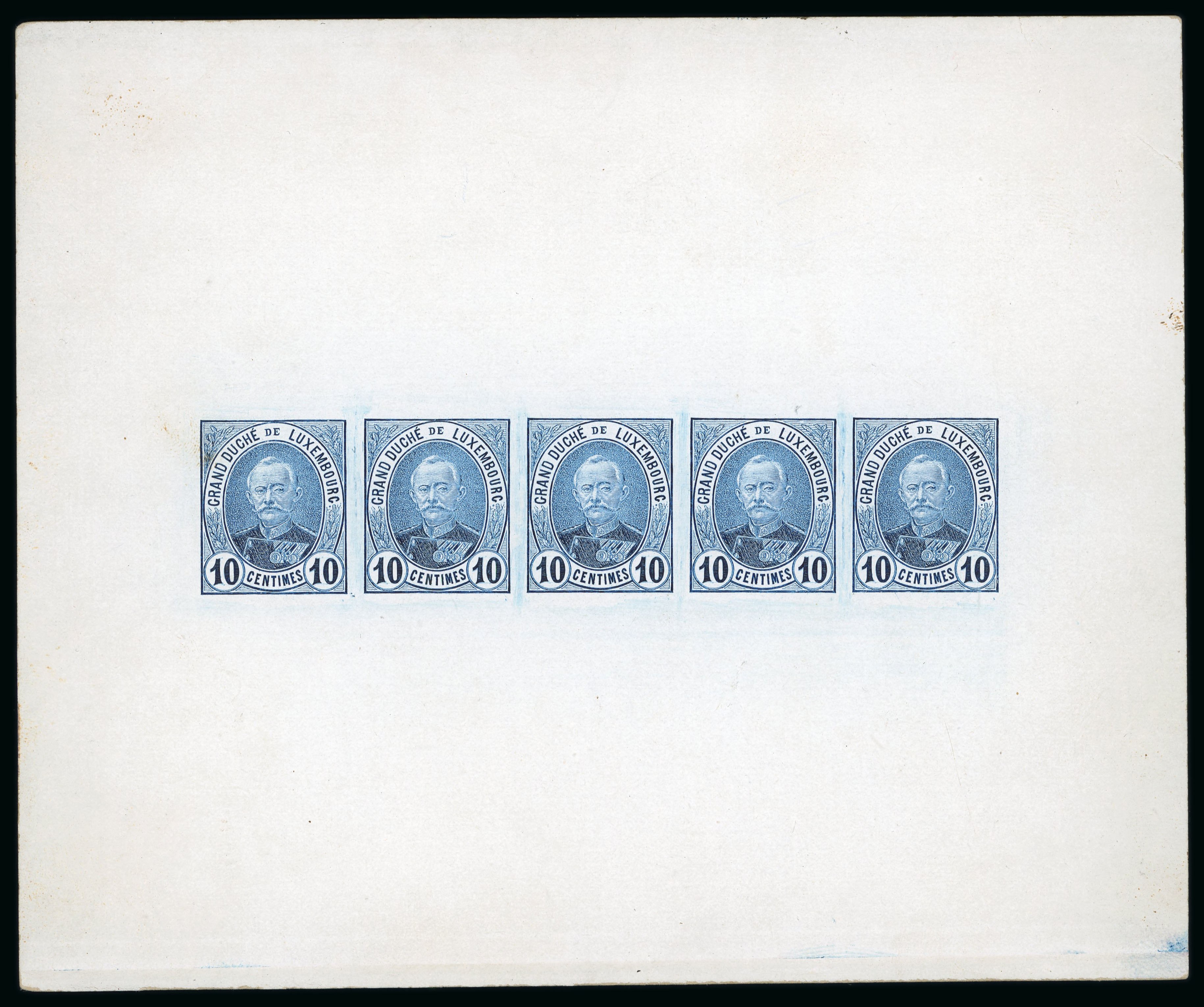 1891 Adolf 10c blue essay in horizontal strip of five printed on thick chalky card by Michel Engels for Enschede, signed FSPL, a rare survivor in full sheetlet form (Image 1)