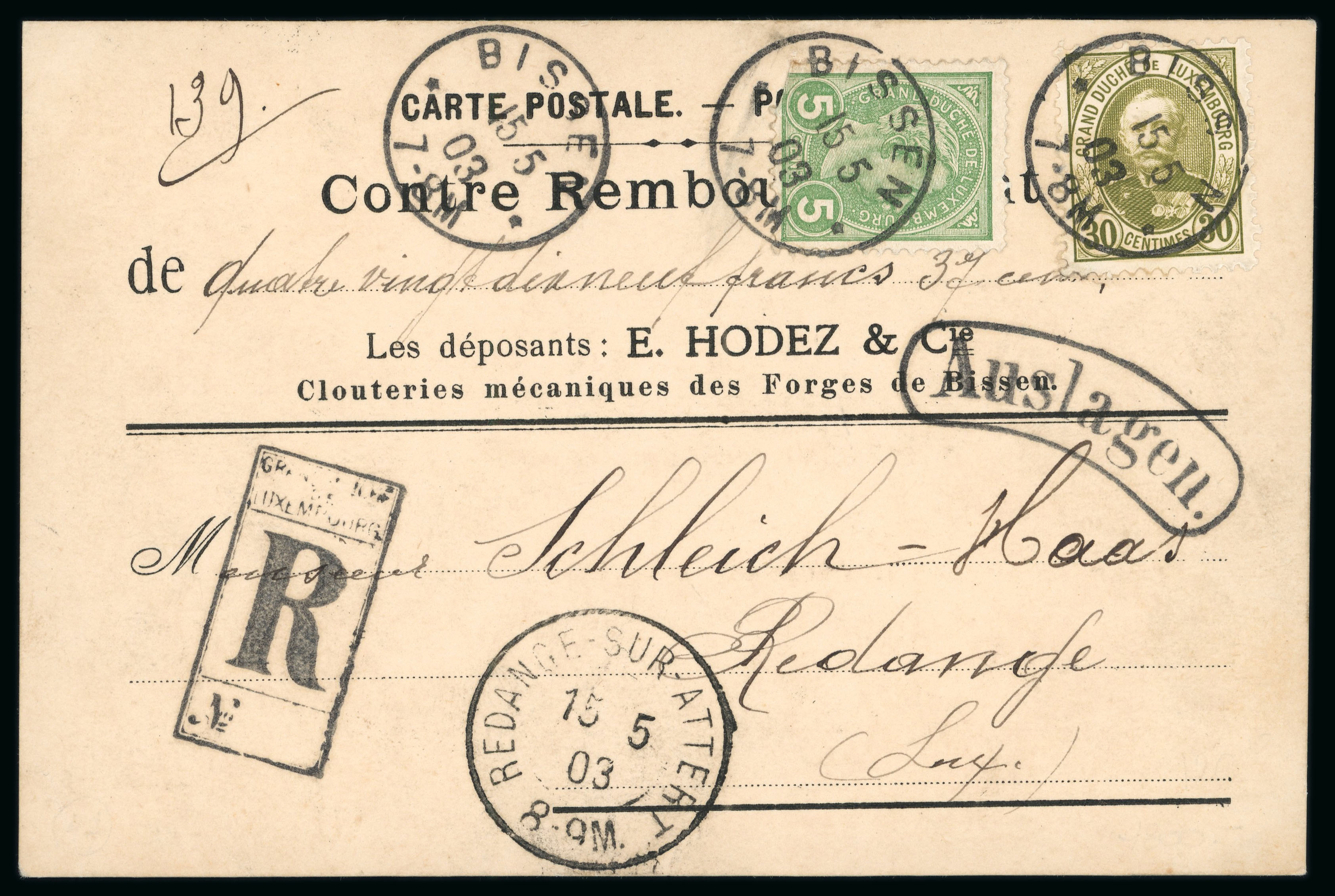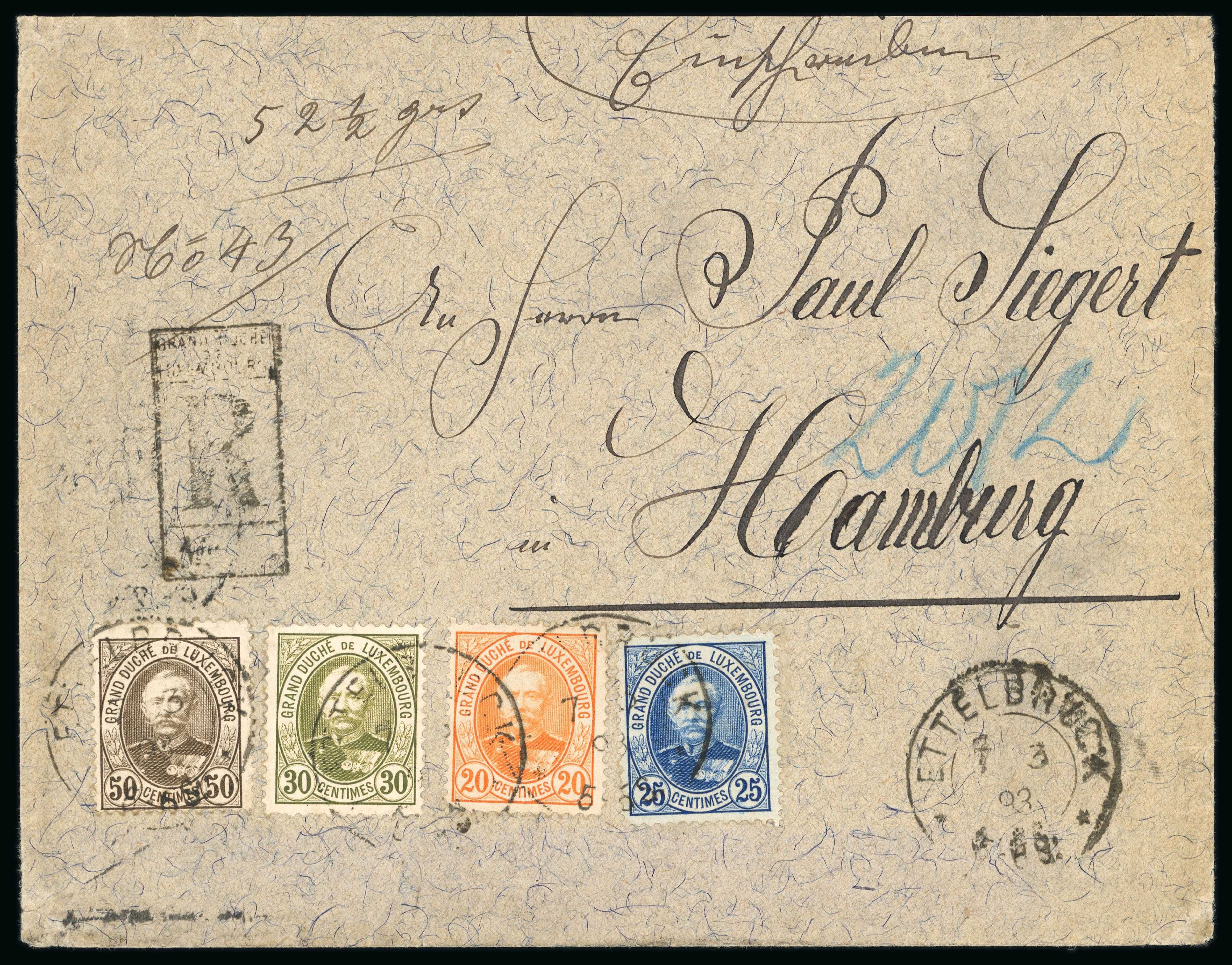 1893 Grossherzog issue four colour franking on registered envelope from Ettelbruck to Hamburg franked 20c., 25c., 30c. and 50c., correct four times rate, scarce franking. (Image 1)
