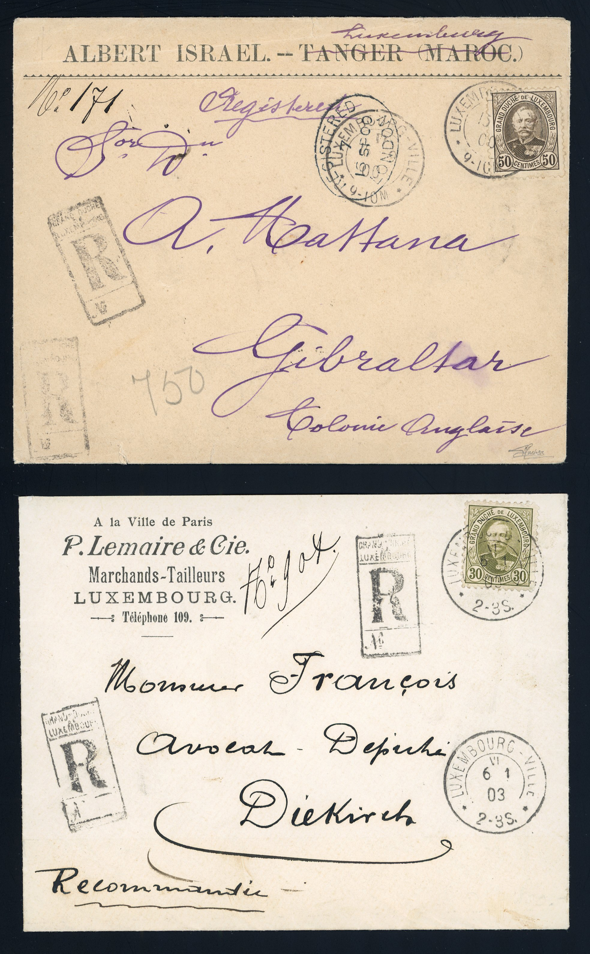 1900s Grosshezog Albert group of six postal history items with 1900 50c registered cover to Gibraltar with arrival date stamp1902 and 1903 Auslagen registered cards in mixed issue frankings, 1903 single franking 30c registered Taylors