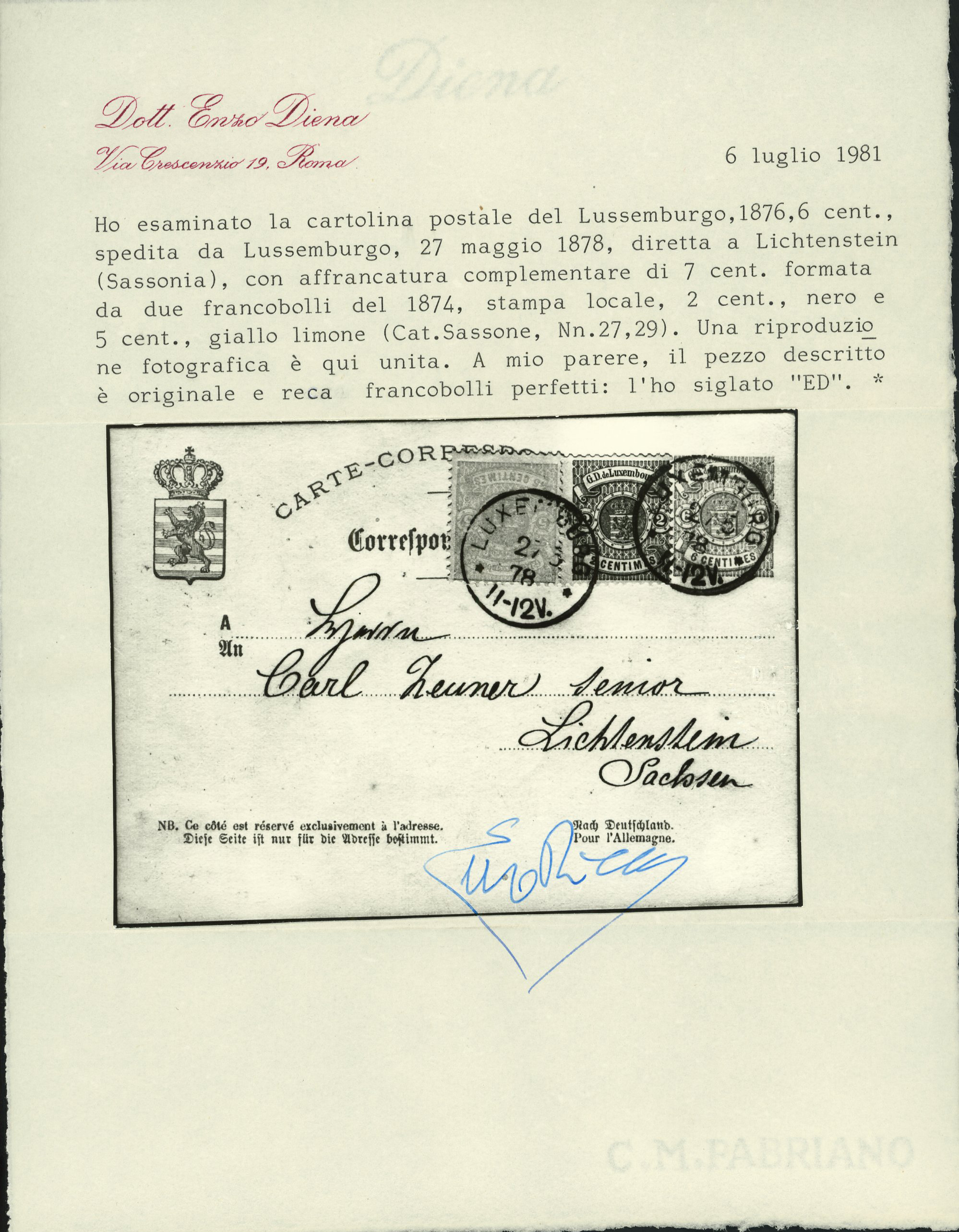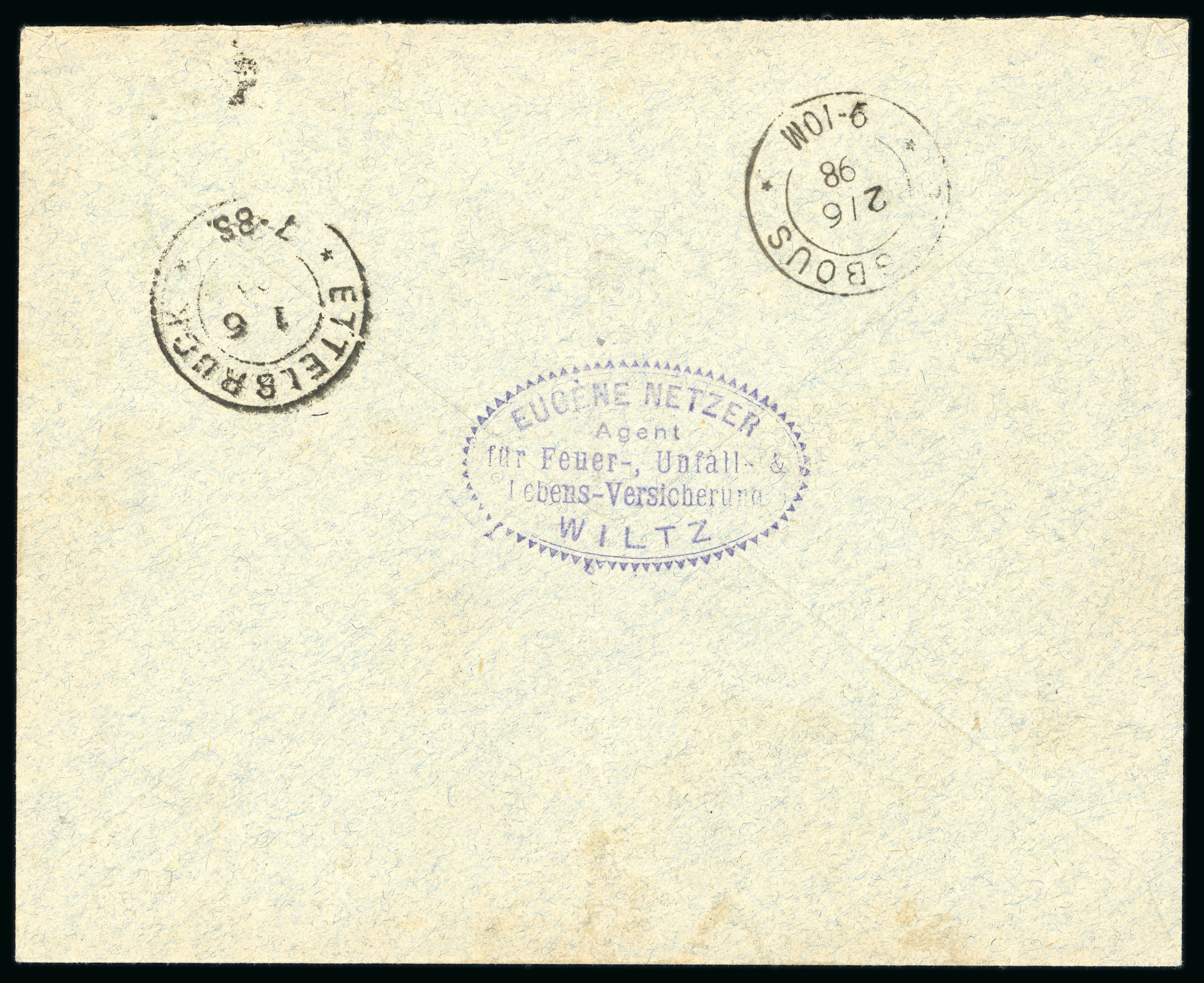 small oval "Officier Brief, Luxembourg" origin cachet and framed "PD" hs, extremely fine and the best of the five examples recorded of this Prussian military use on cover from Luxembourg; signed R. Goebel. (Image 1)