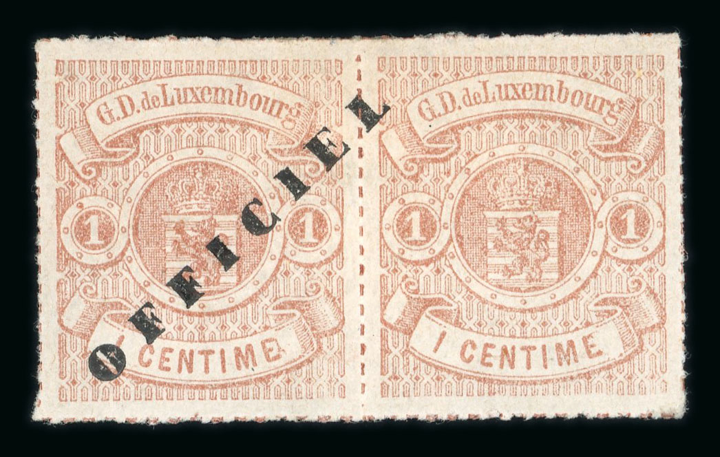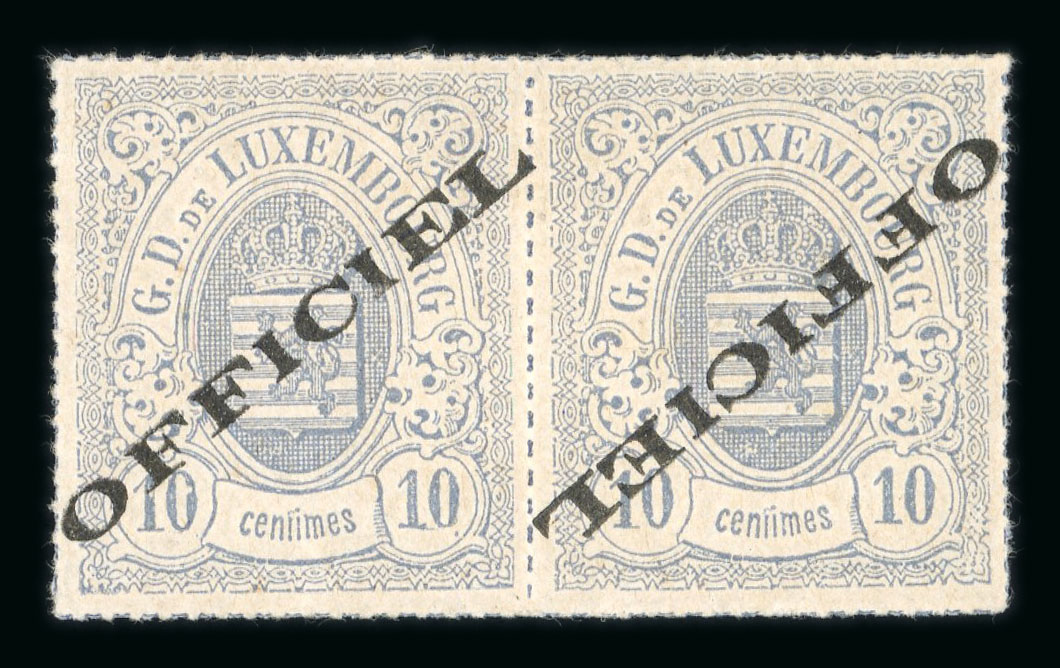Officials: 1875 10c blue violet, colour rouletted horizontal pair, the stamp at right with inverted overprint mint l.h.; a fine and extremely rare pair, FSPL signatures (Prifix without gum Eur 9,375) (Image 1)