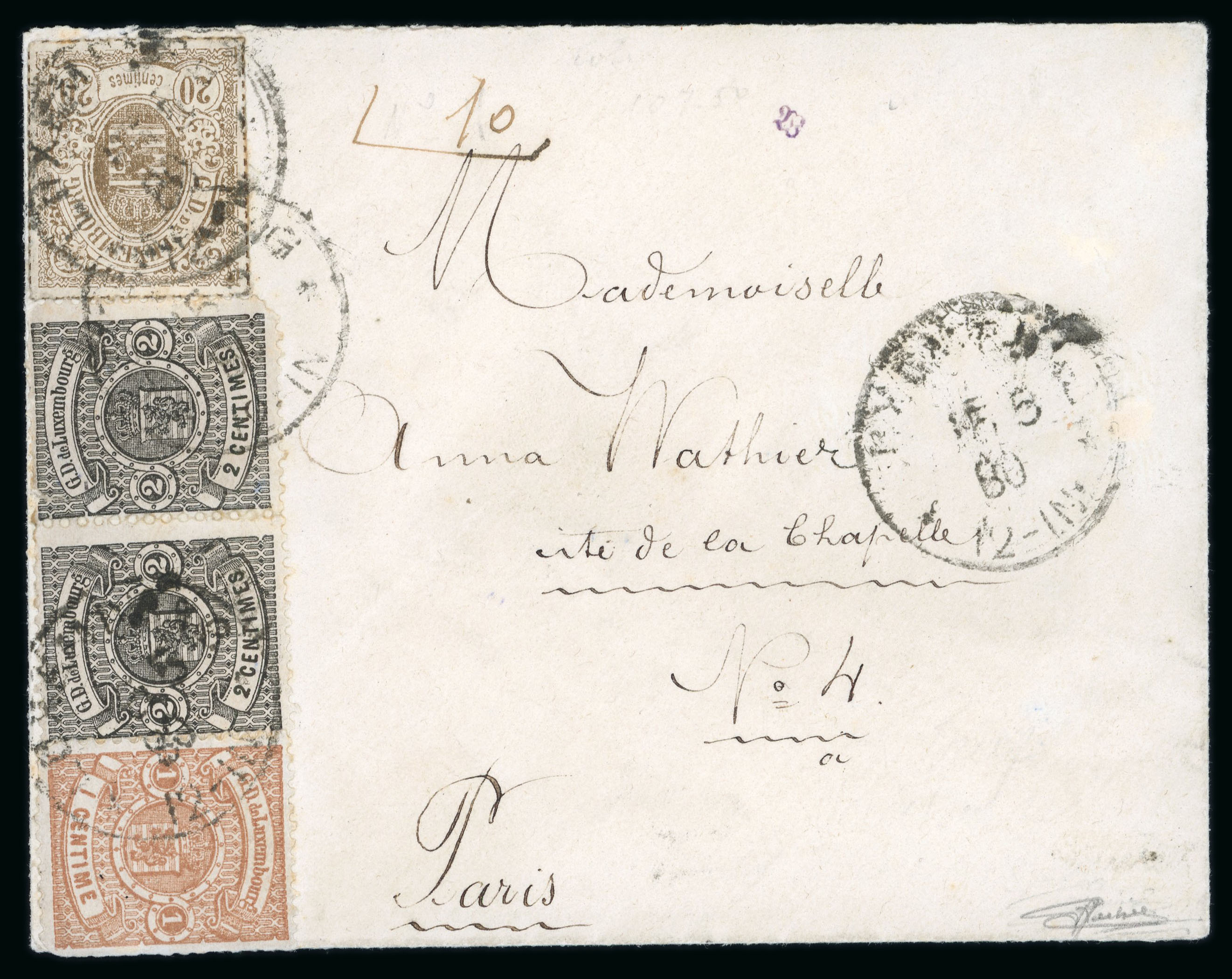 1880 (15.5.) envelope to Paris franked Brück 2c. black, horizontal pair 1c. and colour rouletted 20c grey-brown with Luxembourg cds; some slight faults due to proximity to edge of envelope, a fine UPU franking, signed Goebel (Image 1)