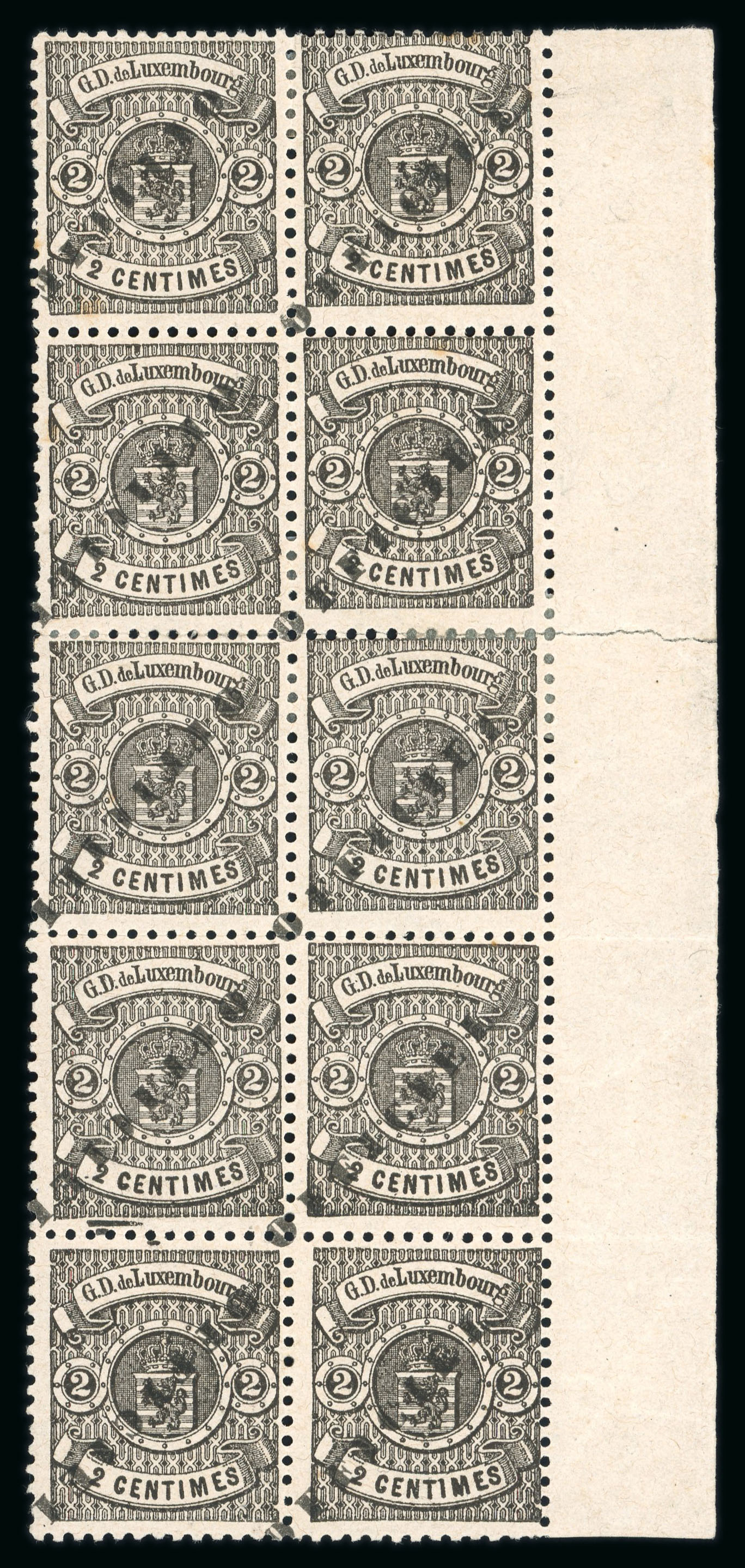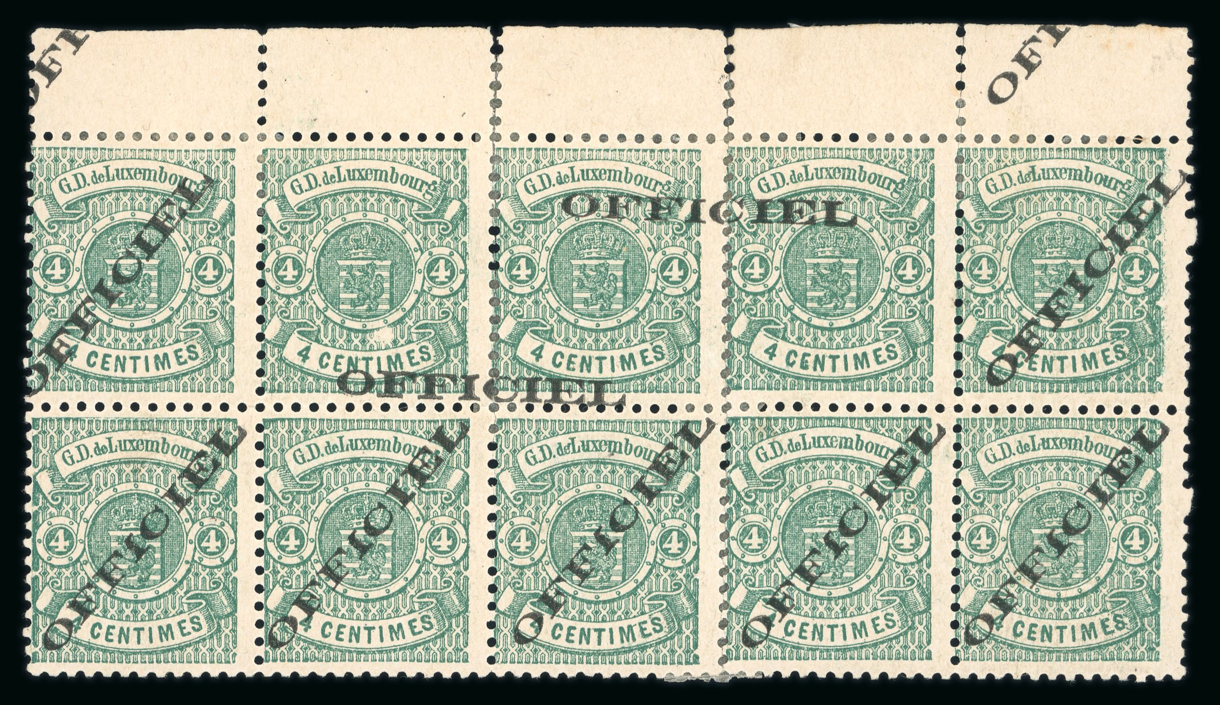 Officials: 1875.78 top margin block of 10 (5 x 2), the middle three stamps of top row with two horizontal OFFICIEL, one towards top, the other at base, heavy hinge reinforcements between third and fourth columns and small thin middle