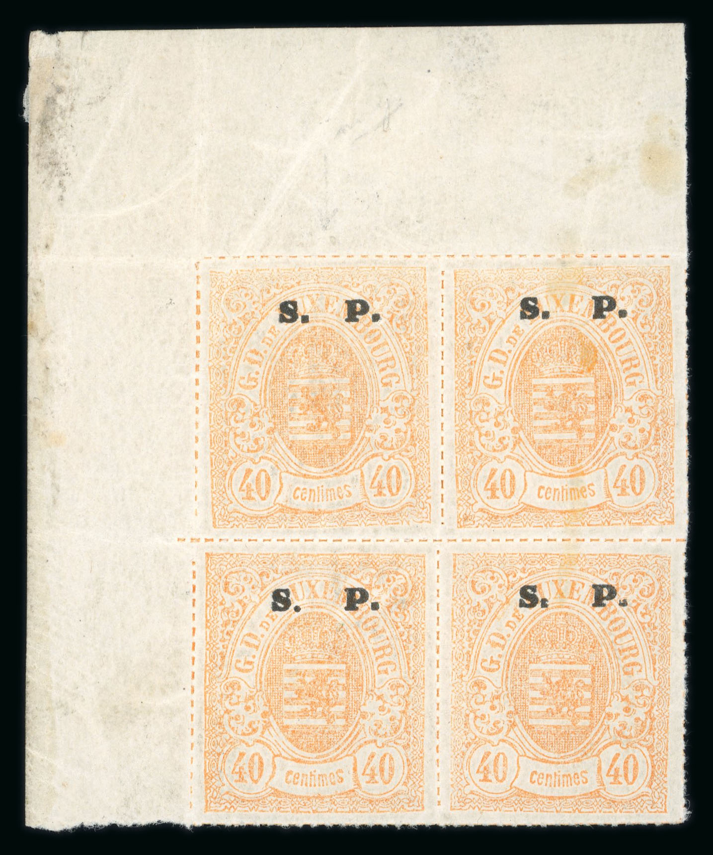 Officials: 1881/82 40c red-orange thick overprint top left corner marginal block of four hinged in margins only, stamps mint n.h.Fine and rare multiple, Ex. Woudenberg, signed FSPL (Image 1)