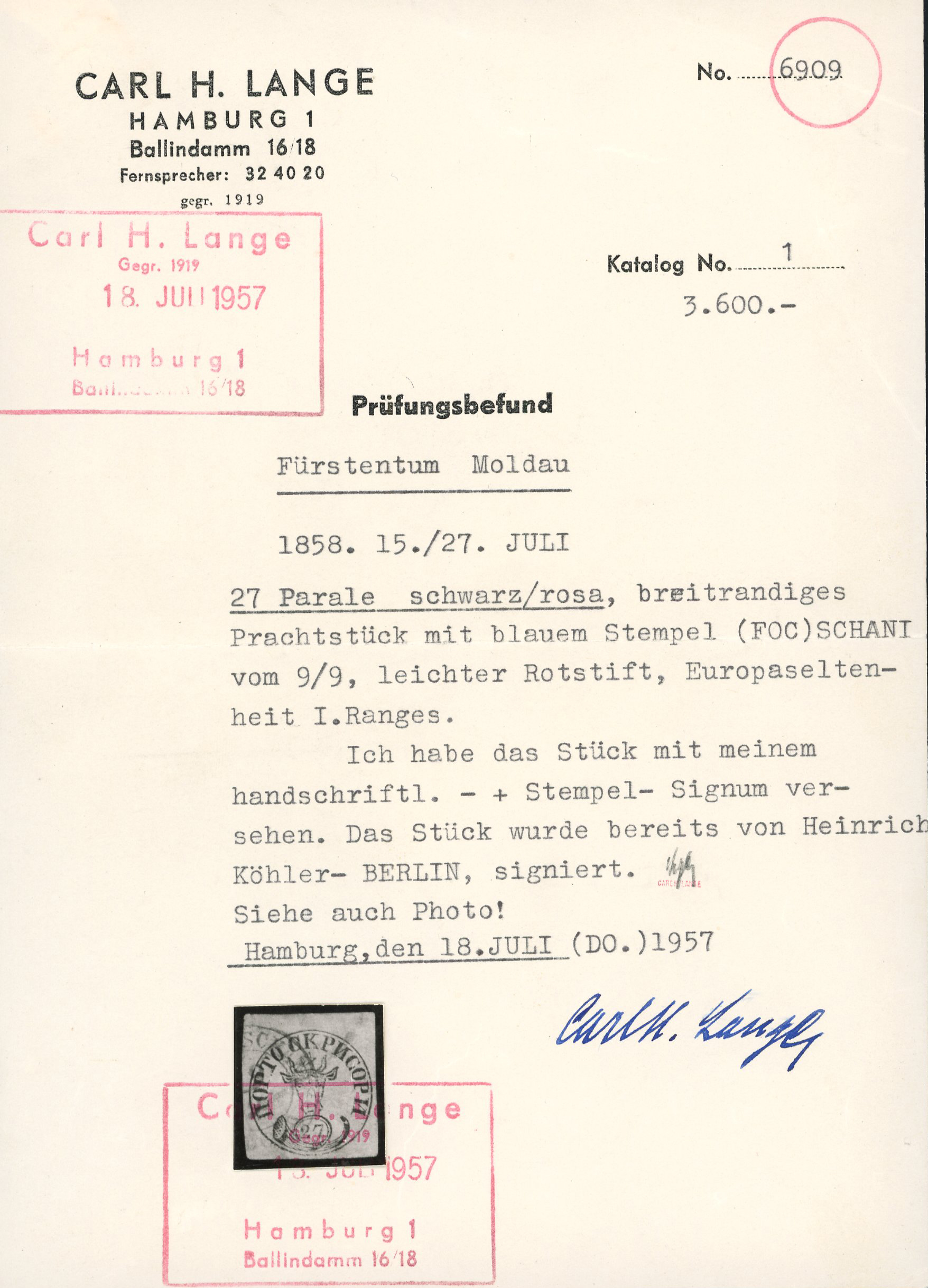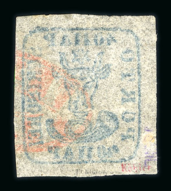 1858 Bull's Head 40 parale blue on white paper, good to large margins all around, cancelled by a fragment of the FRANCO JASSY in red. Very fine. Signed Kohler, Schlesinger & Pfenninger. (Image 1)