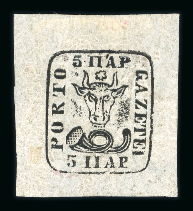 1858 Bull's Head 5 parale deep black, type II, on white paper with large to very large margins all around, very light hinge remnants mostly outside the design, with large part og. A superb, choice example, Signed Thier & A. Diena. (Image 1)