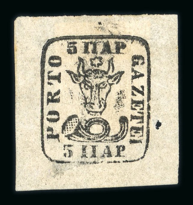1858 Bull's Head 5 parale deep black, type II, on white paper large margins all around, regummed, thinned at base, small hole at right outside the design, hinged. (Image 1)