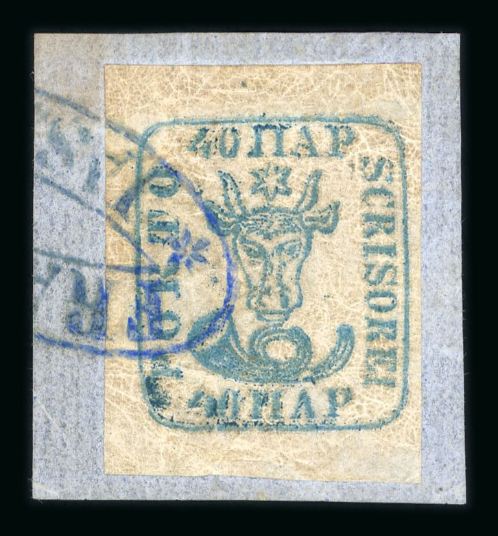 1858 Bull's Head 40 parale blue on bluish paper on small fragment, a good to very large margins example cancelled by a complete strike of the decorative FRANCO GALATZ marking in black. Some tone spots, a desirable item nonetheless. Signed