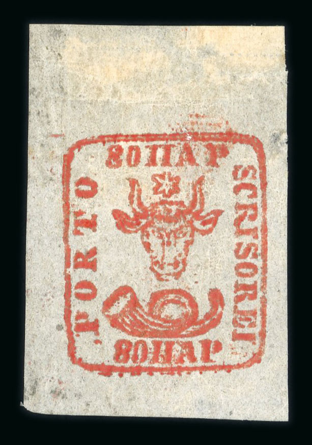 1858 Bull's Head 80 parale red on white paper, with large to very large margins all around, very light hinge remnants mostly in the top margin, small thin spots outside the printed image, large part og. A fine to very fine scarce example.