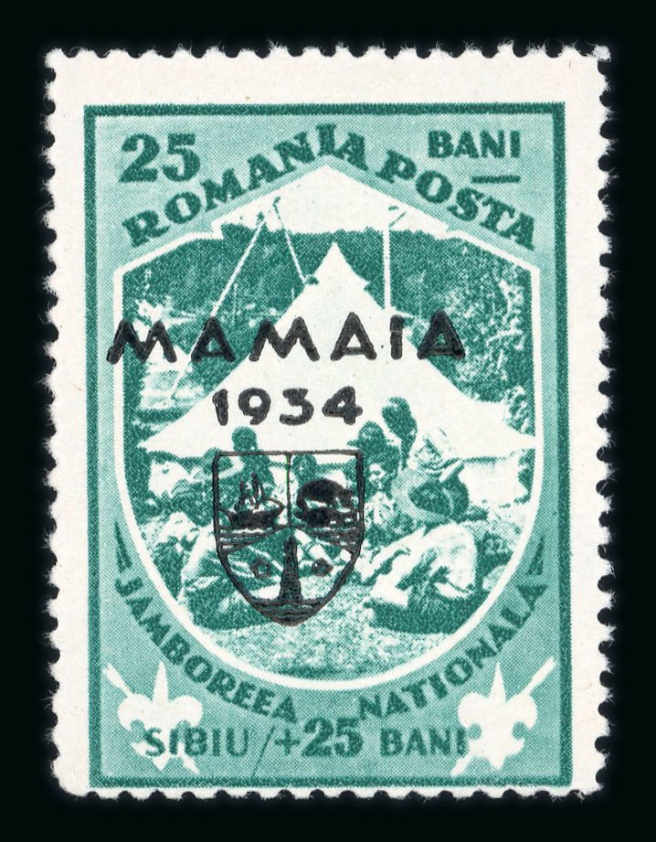 1934 Mamaia Jamboree, Scouts Issue: overprint proof, 1+1L green with red overprint. Mint never hinged, very fine condition. Rare. (Image 1)