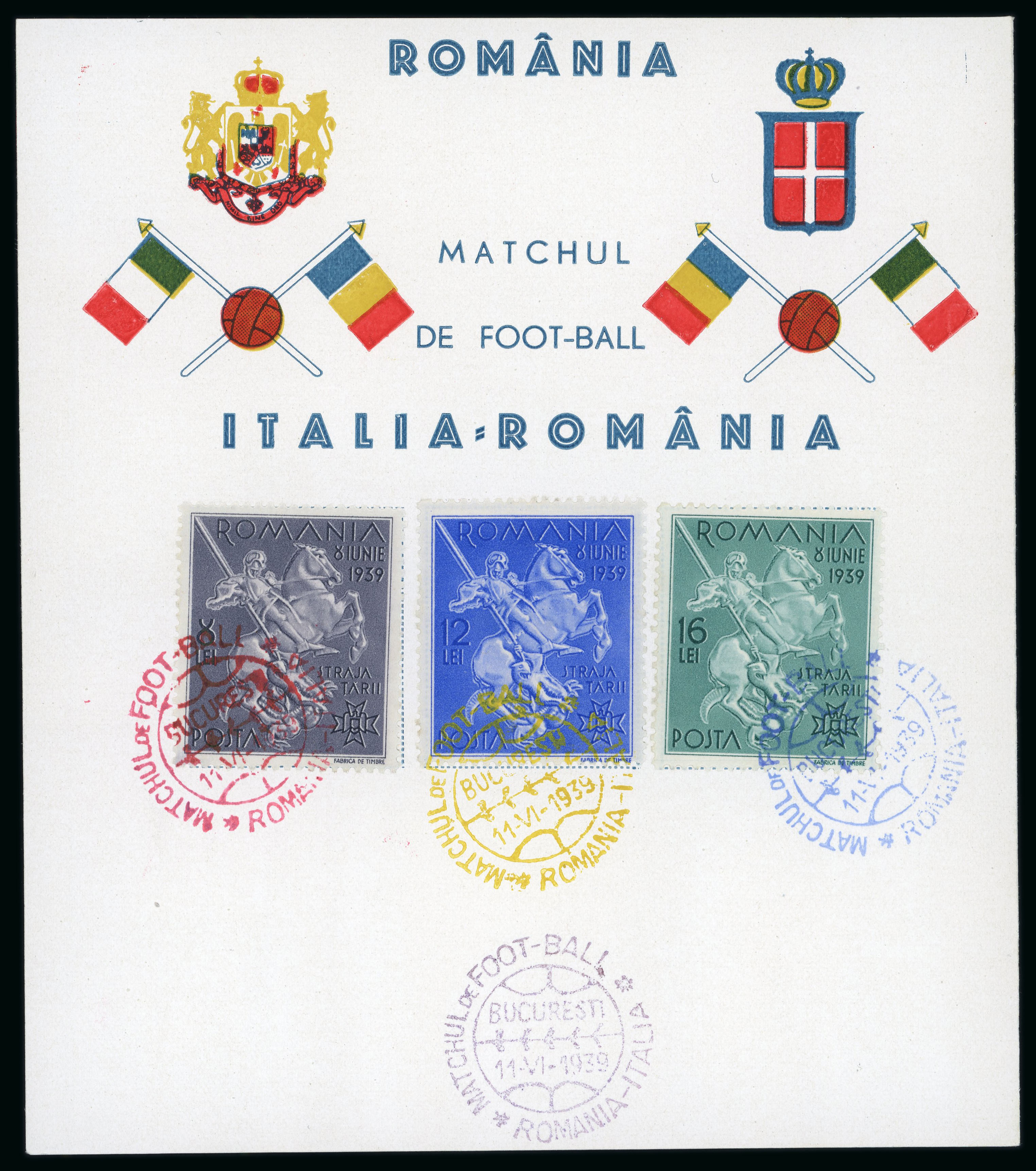 1939 Six souvenirs of the football game Italy-Romania bearing the special marking of the event cancelling various stamps (mainly from the 'Saint George' scouts set. Some creases, but generally fine condition. (Image 1)