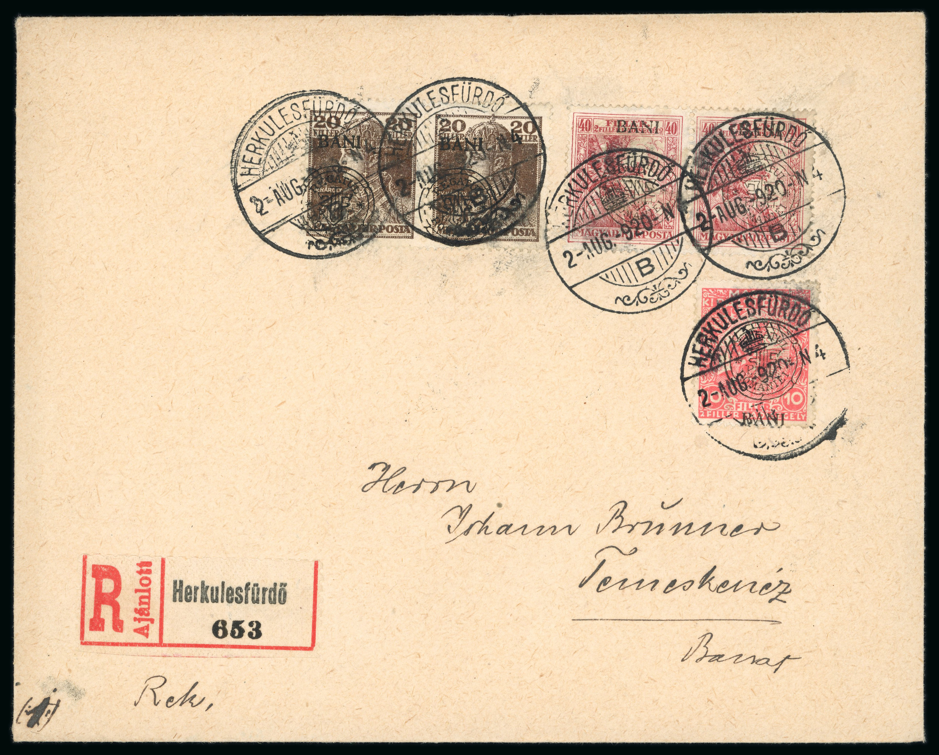 1919-20 Group of five covers bearing Hungarian & Romanian overprinted stamps: two domestic registered covers bearing 'Cluj' stamps and mixed franking between the 'Cluj' issue and Romanian stamps; two philatelic covers bearing the stamps