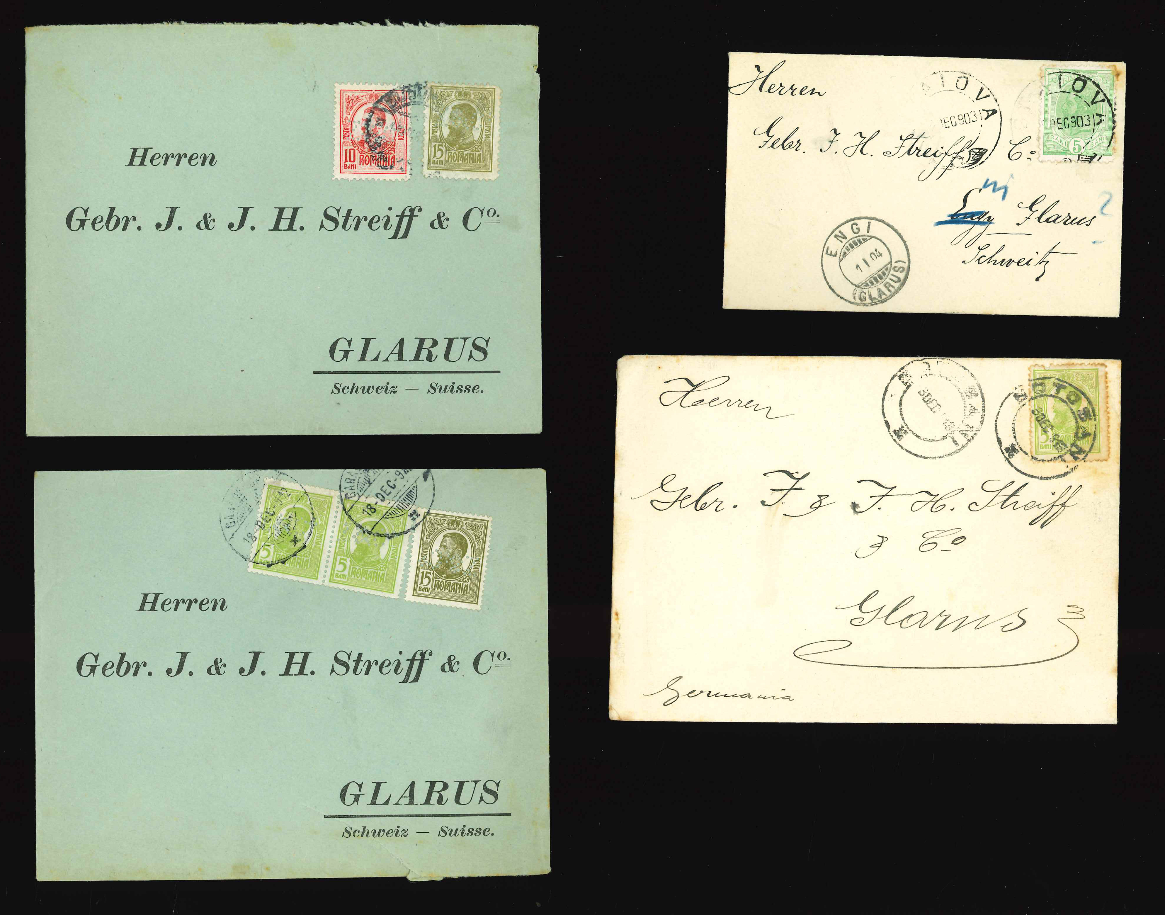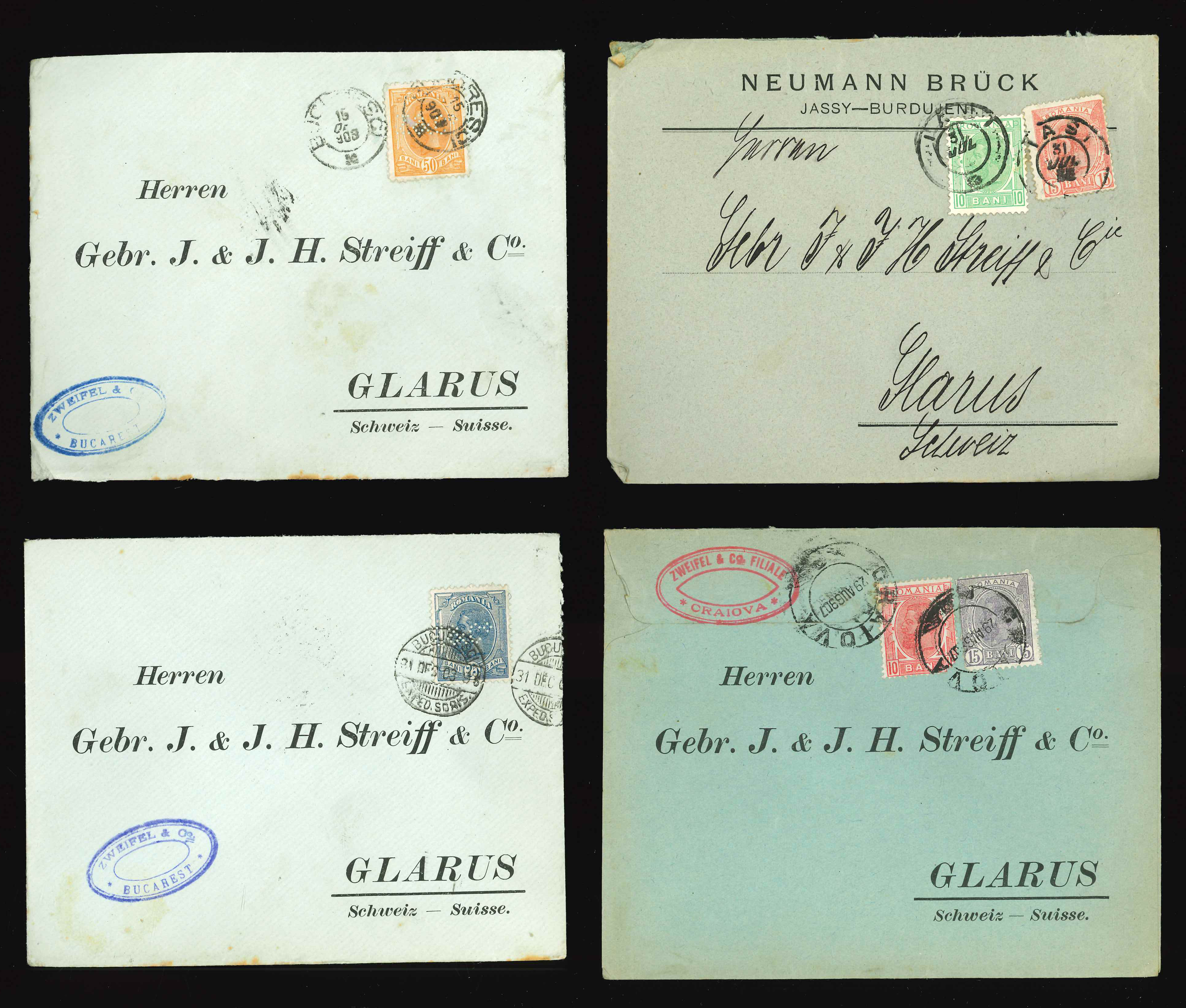 1898-1914 Group of 16 commercial foreign covers, each bearing different postal rates and frankings with King Carol I definitive issues ("Spic de Grâu" / Ears of Wheat; Gravate/Engraved; Tipografiate/Typographed). Seven covers