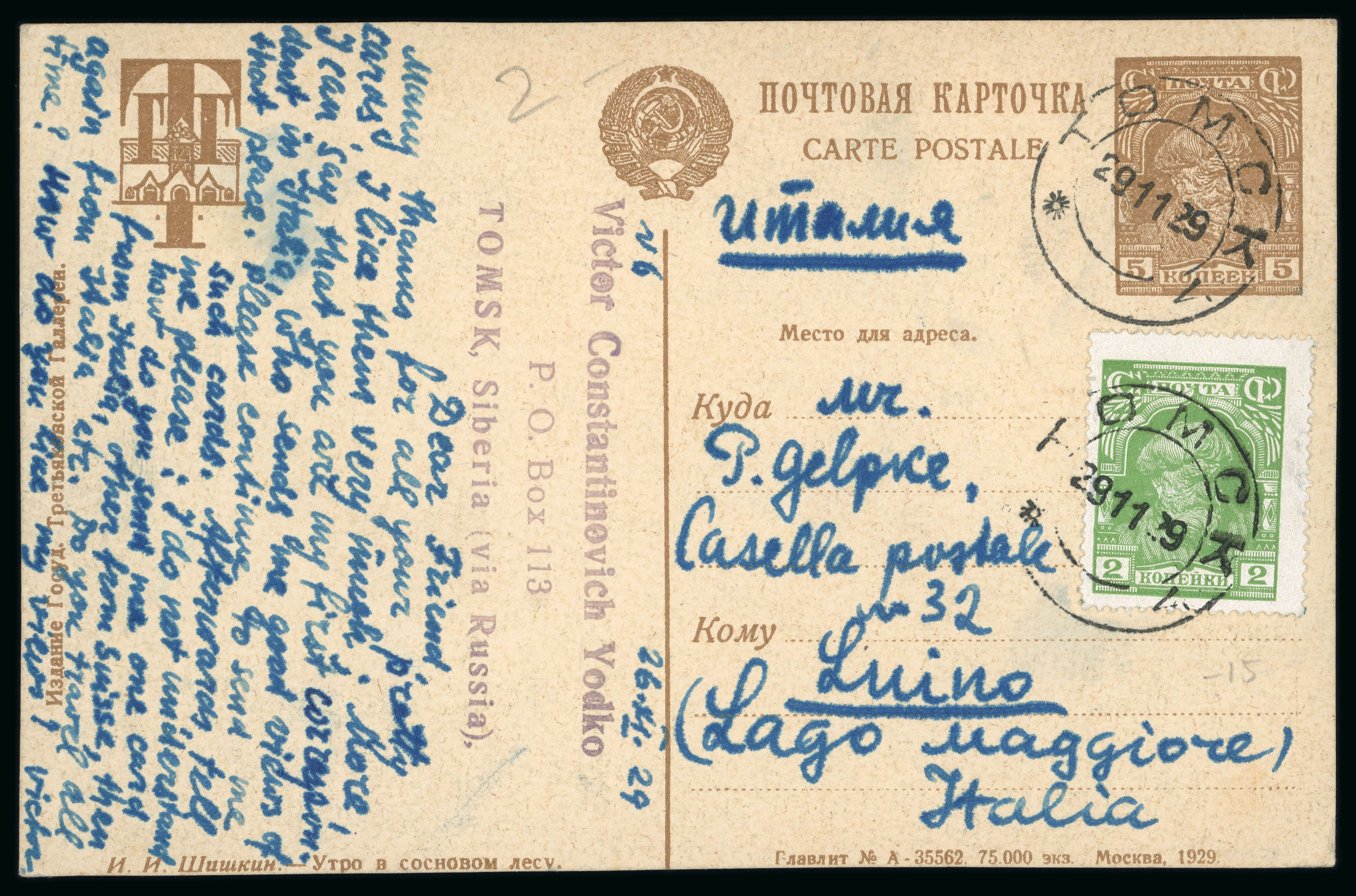 stationery cards with views or propaganda including 7k uprated card to Geneva advertising safety matches, 10k and 20k cards unused with images on reverse of 1923 5p Airmail stamp and 10p Worker respectively and 1929 uprated card from Tomsk to Italy