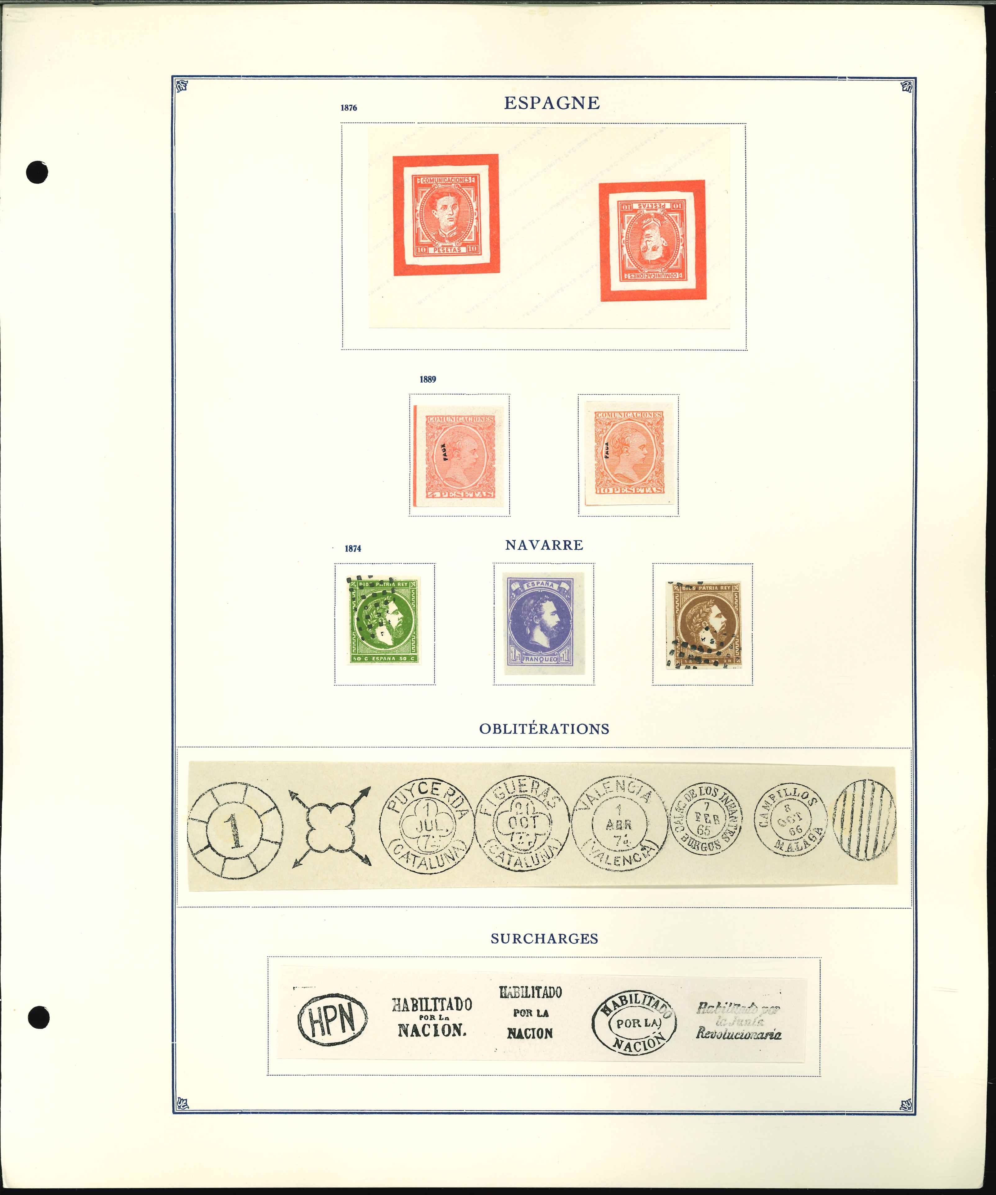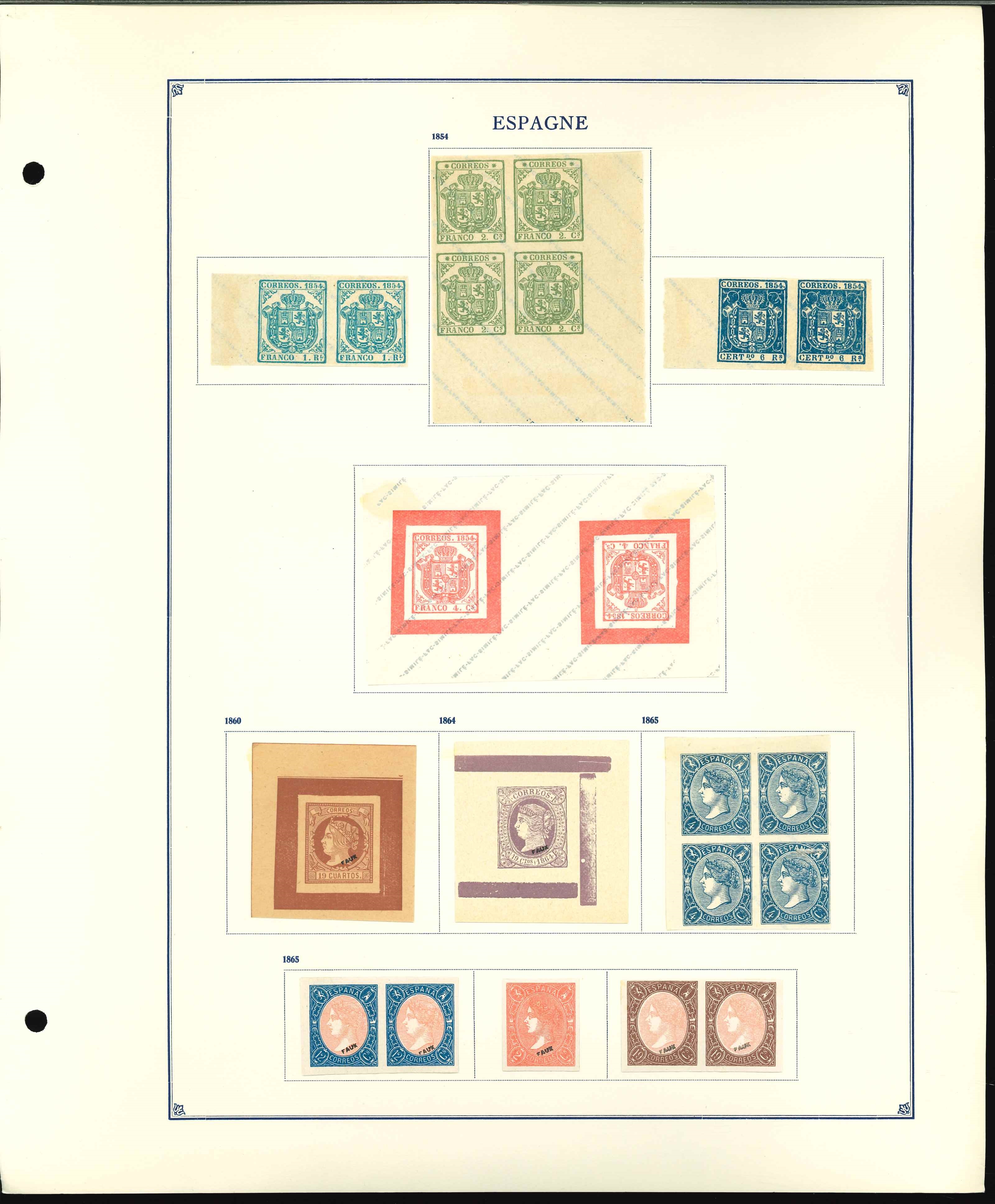 Seven pages of forgeries from the Fournier album with singles or multiples, either handstamped 'Faux' on front or diagonally overprinted Facimile on reverse, reproductions of issues from 1850 to 1880 with singles and