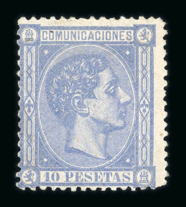 1875, Alphonso XII 10 Pesetas blue mint without gum, signed Calves, fine.(Mi. €1'700). (Image 1)
