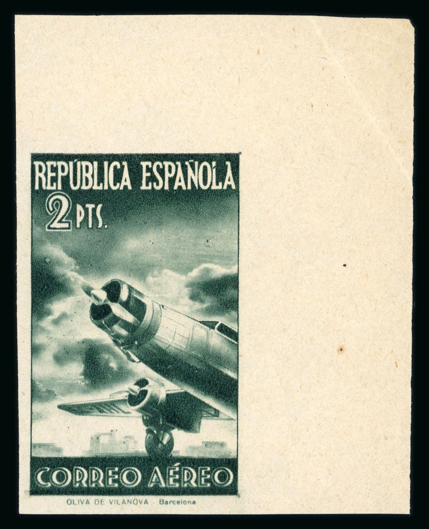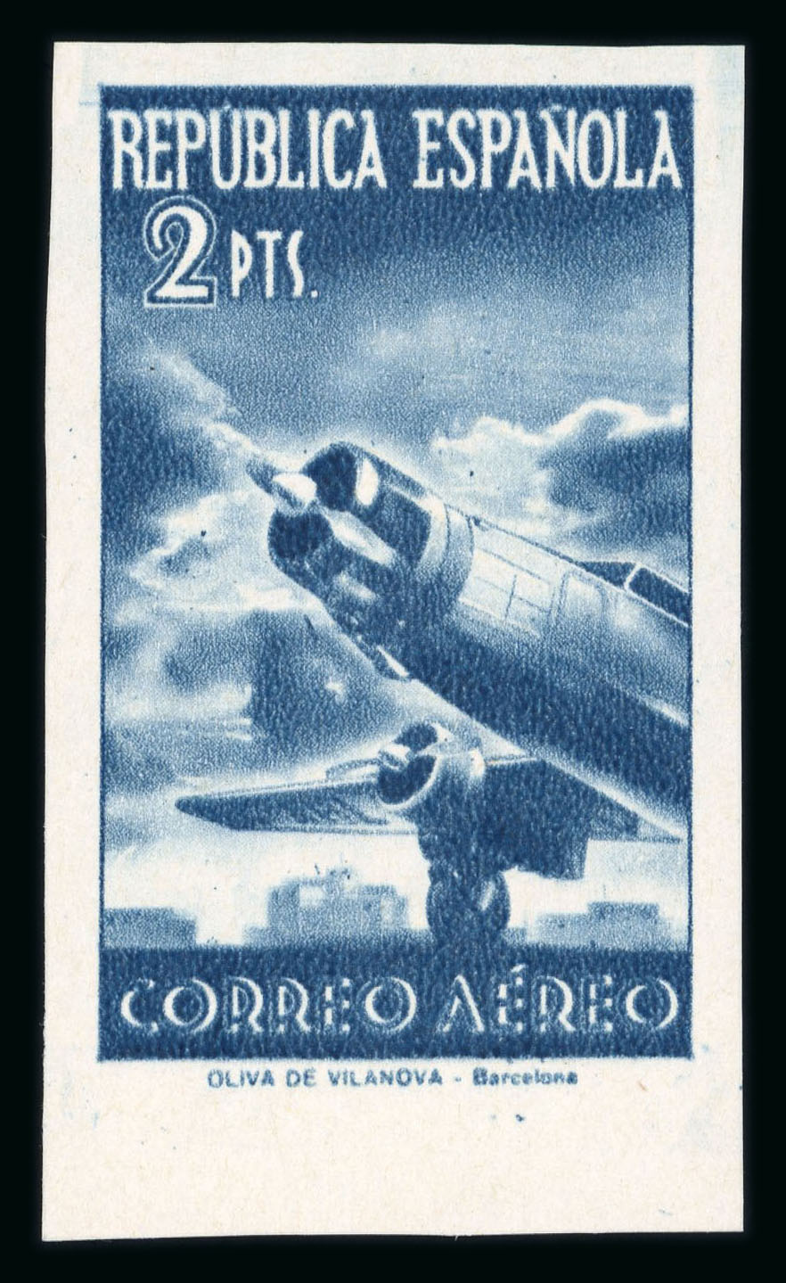 1939 2pts dark green ("verde oscuro") unissued airmail, imperforate mint no gum (as normal), top right corner marginal, position 10, very fine and rare; cert. Comex (2005) (Edifil NE42, €2'500). (Image 1)