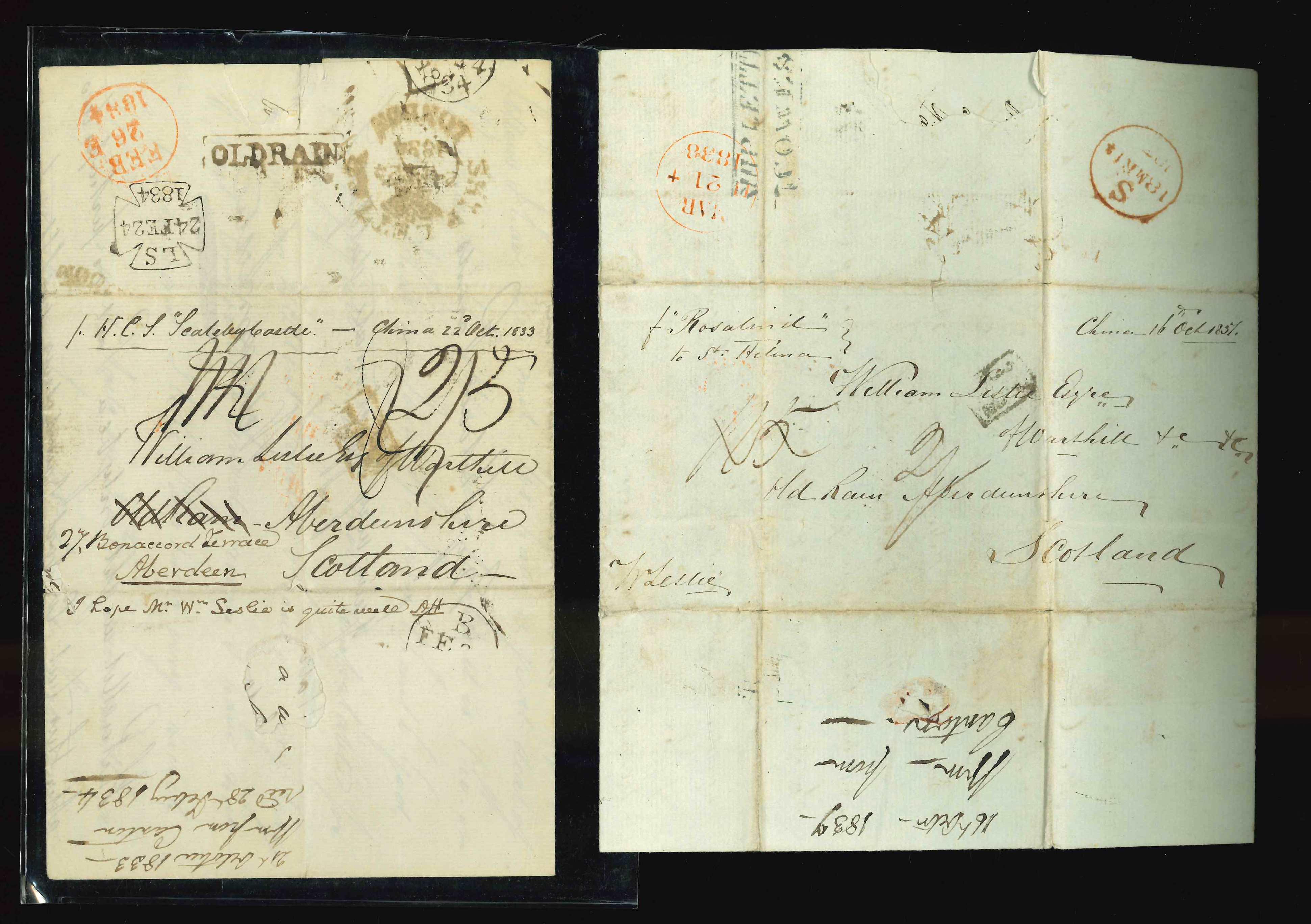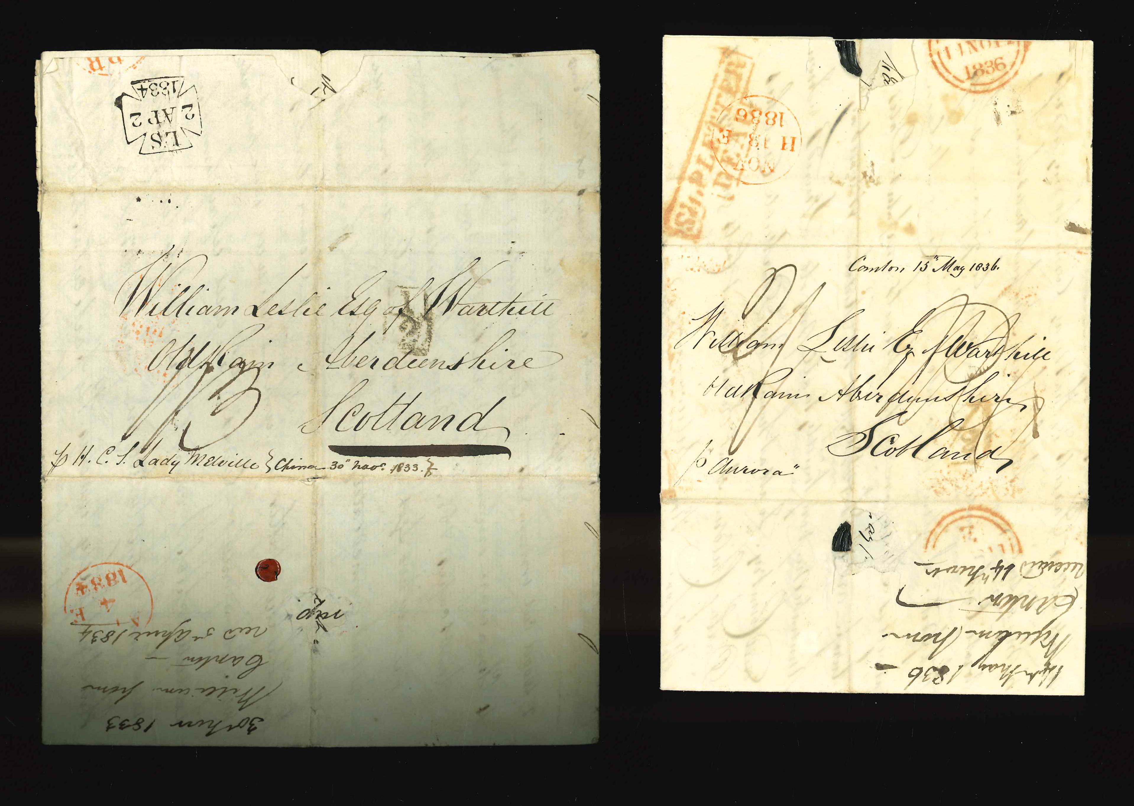 Canton 1838 (Aug. 24), entire letter to William Leslie in Old Rain, Aberdeenshire, Scotland with manuscript endorsement “Per Mary Anne Loebb from China 25 Aug 1838”; on reverse are red 2-line unframed LIVERPOOOL SHIP LETTER and datemark