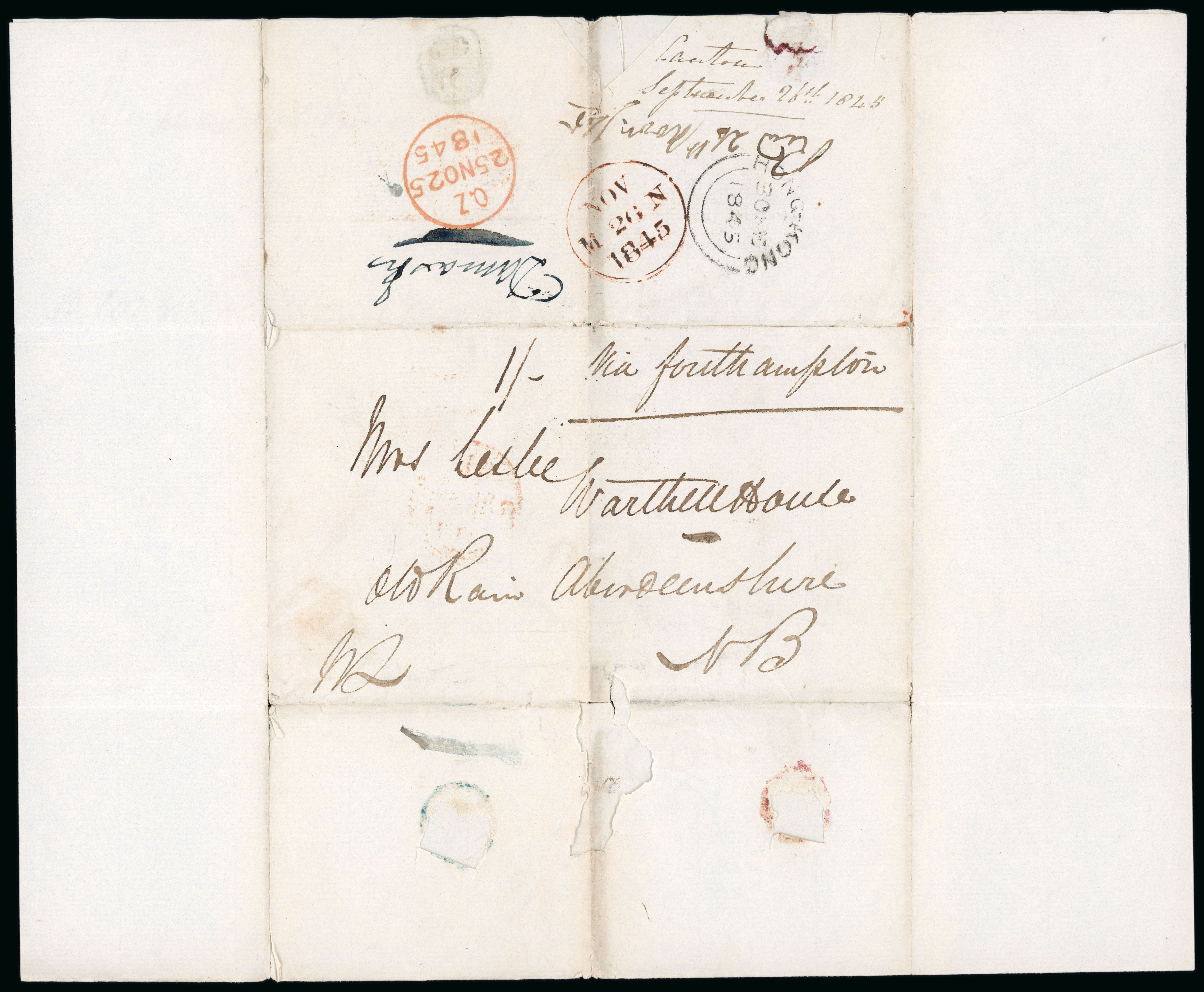 Canton 1845 (Sep. 26), entire letter to Old Rain, Aberdeenshire, Scotland with manuscript endorsement “Via Southampton”; reverse with date stamps of 25, 26 Nov. and double lined circular Hong Kong 30 SE 1845, taxation 1 shilling noted on