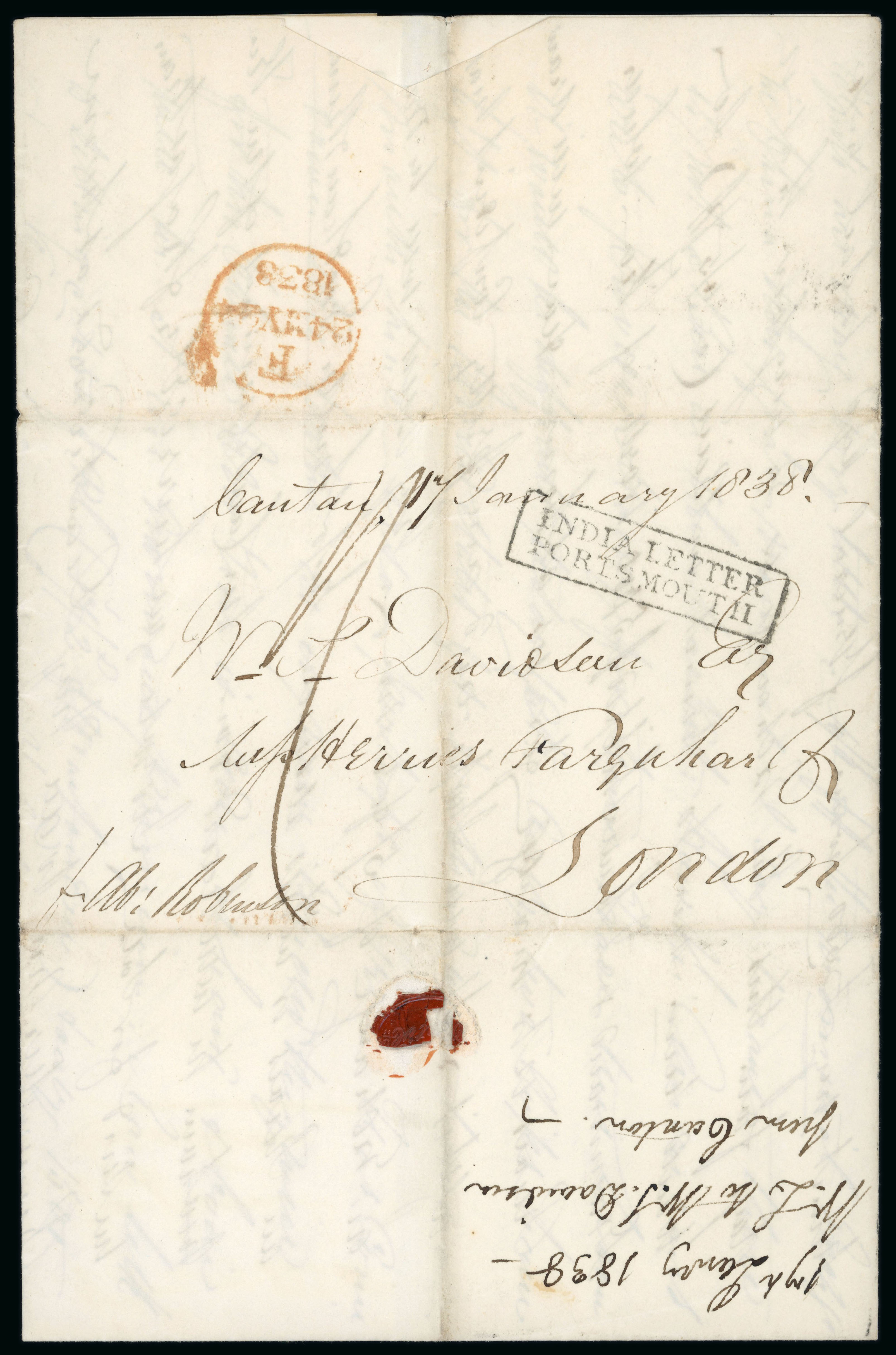 Liverpool, Deal, Plymouth, Portsmouth, Penzance), transit markings and manuscript postal charges. A fascinating correspondence about the early commercial scene in China in the period leading up to the Opium Wars. Also a Canton letter 1838 routed via
