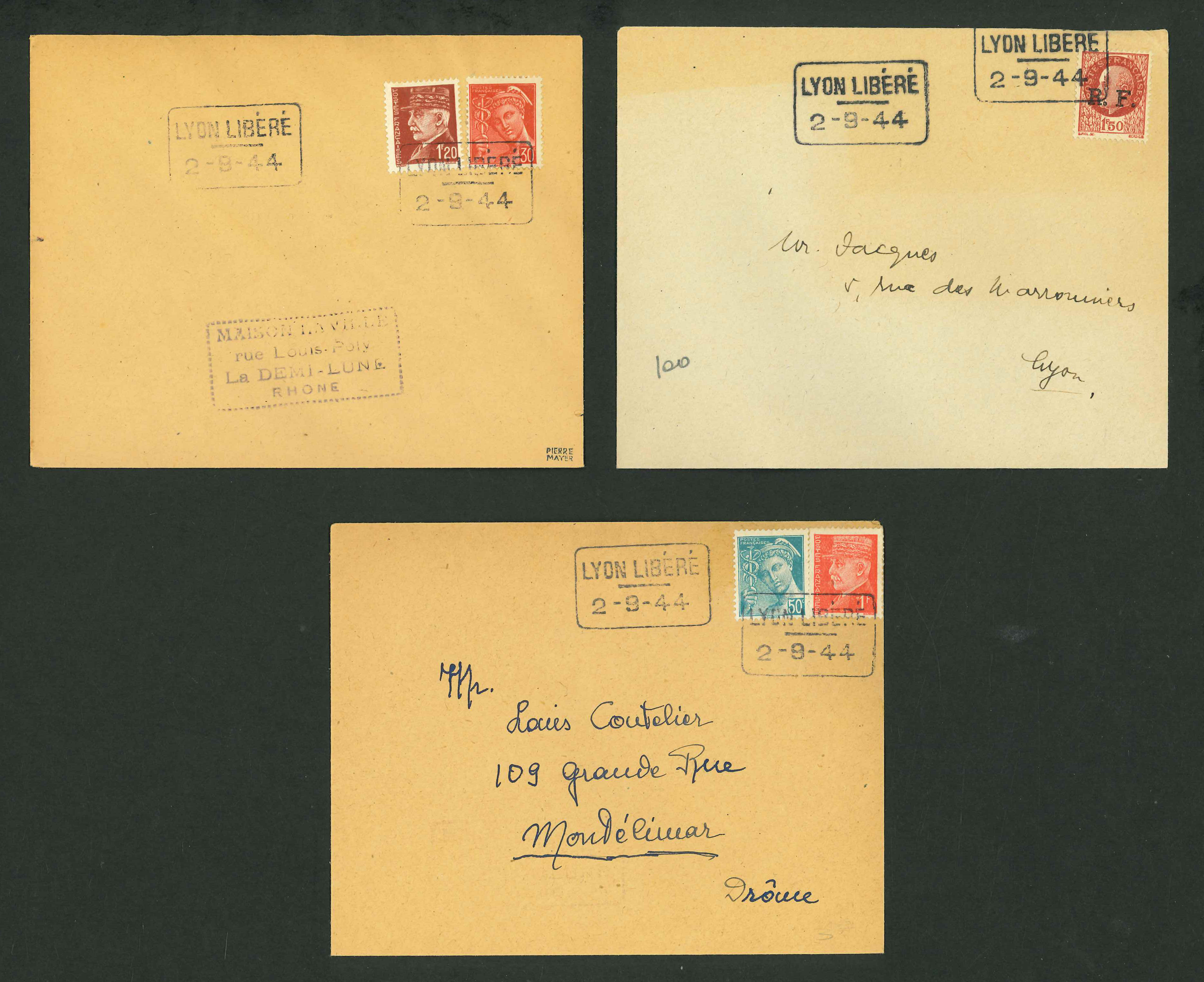 Lyon : 1944, lot de sept lettres, cartes et entiers tous avec cachet "Lyon Libéré 02-09-44" dont entier postal Pétain 1f20 brun rouge, la plupart signés Calves, Mayer et Scheller, TB. (Image 1)
