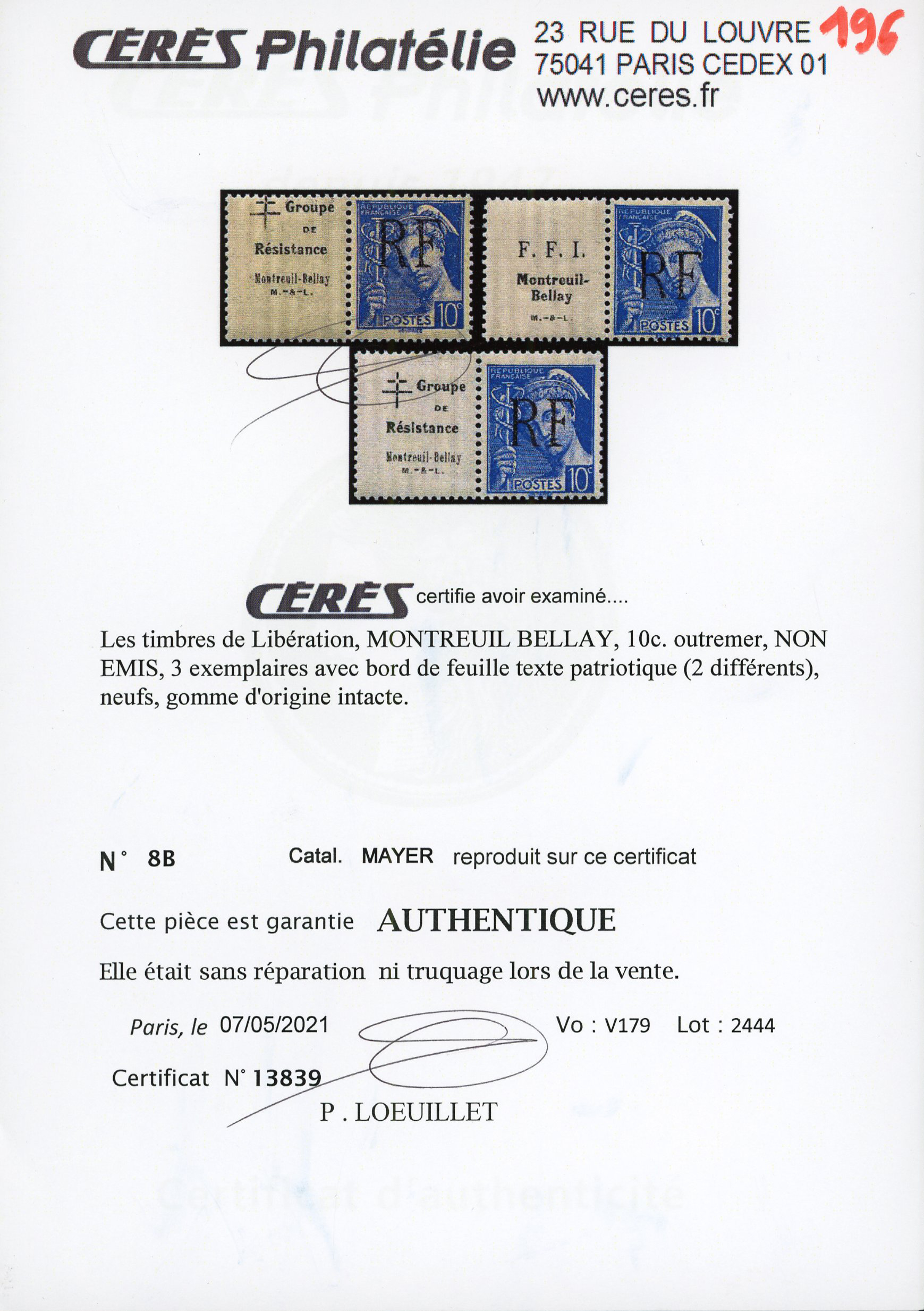 MONTREUIL-BELLAY (Maine et Loire) : n°8B 10c outremer, NON EMIS, 3 exemplaires avec bord de feuille texte patriotique (2 différents) neufs ** MNH. Certificat Loeuillet (2015) et signatures Scheller pour tous. TB. (cote Mayer €1'500). (Image 1)