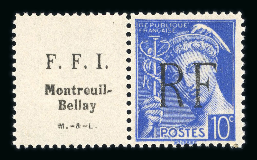 MONTREUIL-BELLAY : 1944, Mercure 10cts bleu République Française non émis Mayer n° 8A, deux paires neuves ** mnh, une paire veticale et une paire horizontale, signés Scheller, TB (Mayer €1'080). (Image 1)
