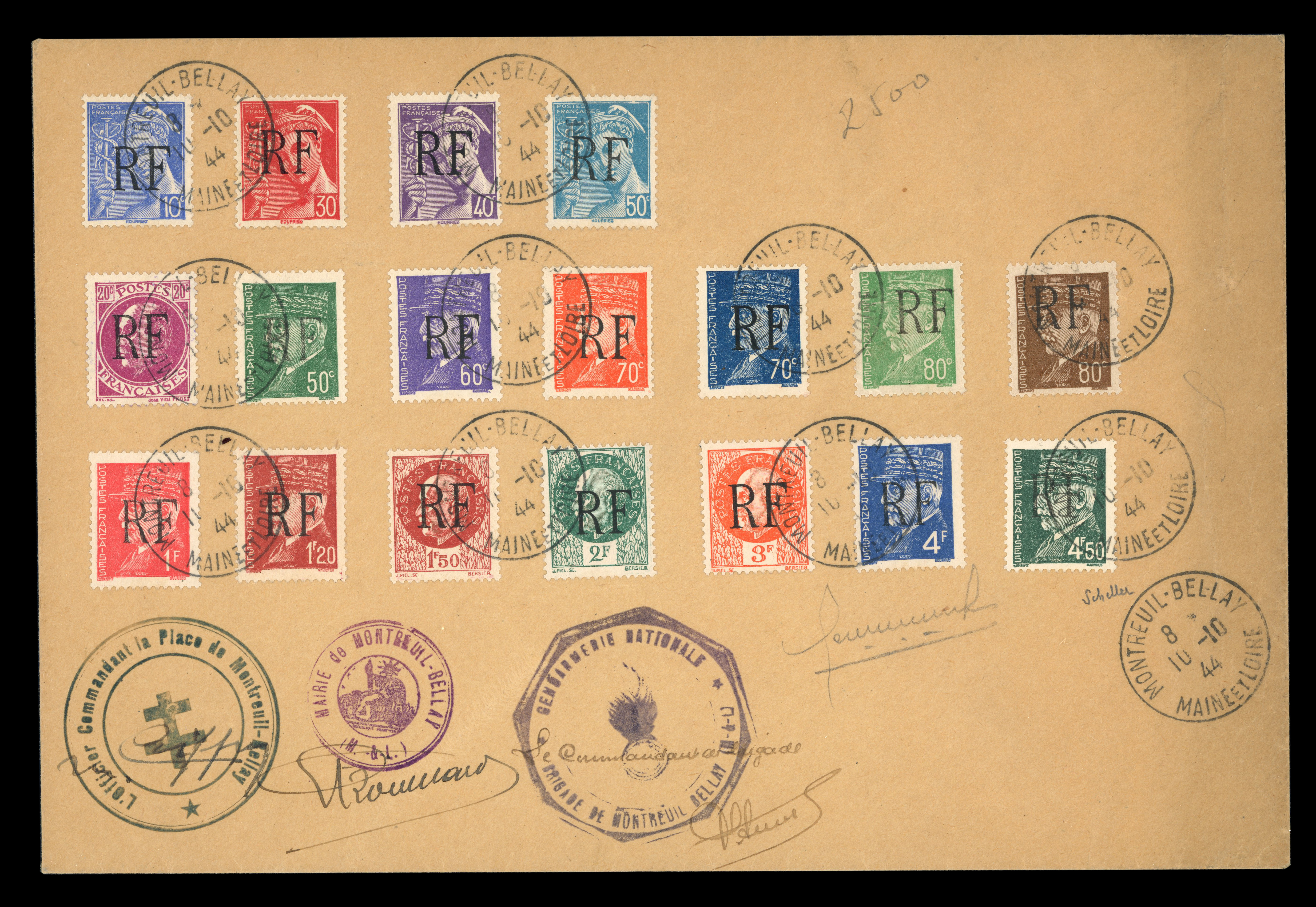 MONTREUIL-BELLAY (Maine-et-Loire) : PIÈCE UNIQUE mentionnée dans le catalogue Mayer : grande enveloppe affranchie des n°8 à 20, 22, 25, 27/28 oblitérés càd Montreuil-Bellay du 10 octobre 1944 + cachets de l'officier commandant de la place