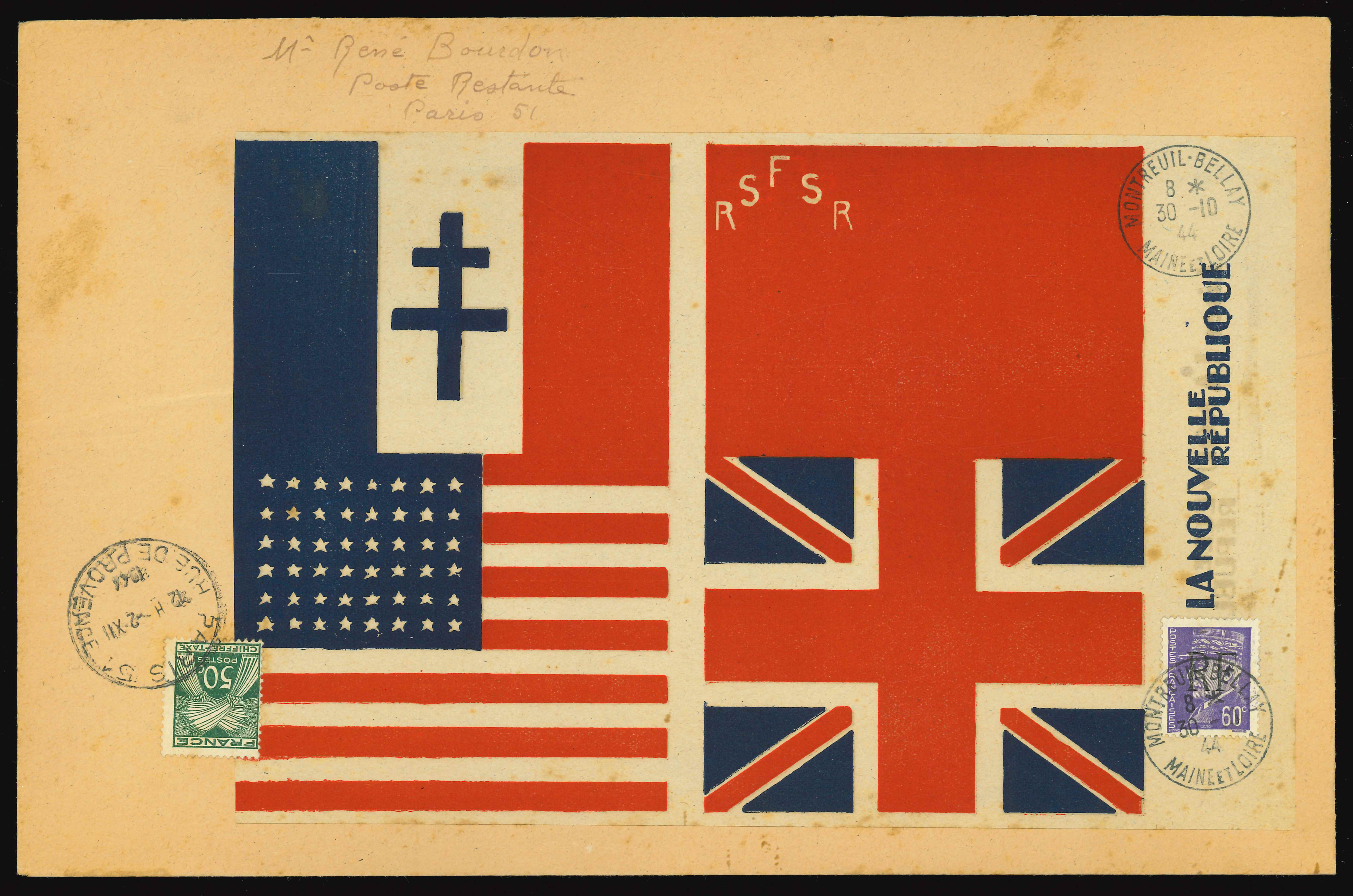 MONTREUIL-BELLAY (Maine-et-Loire) : PIÈCE UNIQUE mentionnée dans le catalogue Mayer : grande enveloppe affranchie du 60c violet avec cachets drapeaux anglais, américains et français + croix de Lorraine oblitérés càd Montreuil-Bellay du 30