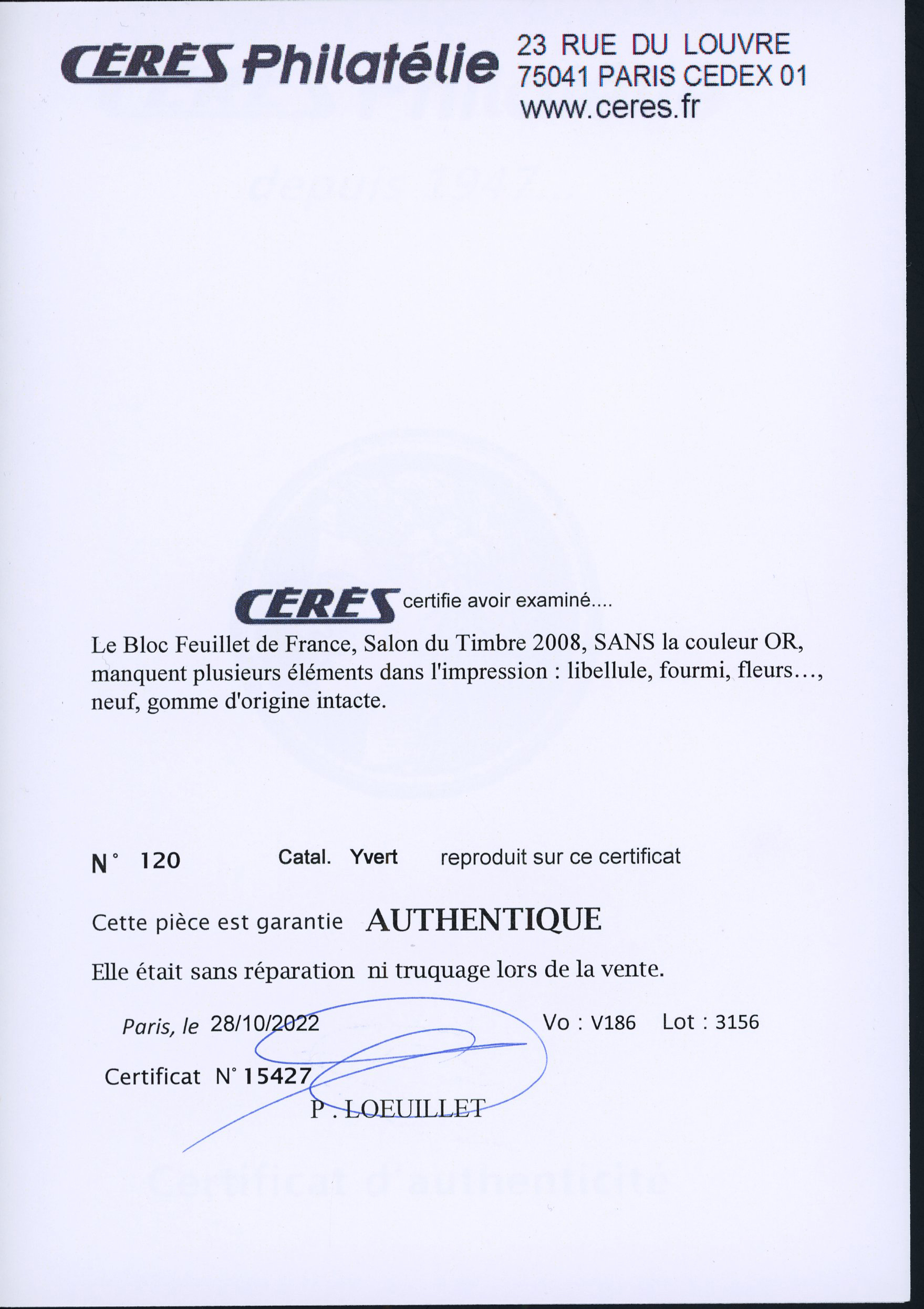 2008, bloc-feuillet du salon 2008 Y&T n° 120 superbe variété sans la couleur or + libellule, fourmi et fleurs manquants, bloc neuf ** MNH, spectaculaire et TB, certificat Cérès. (Image 1)