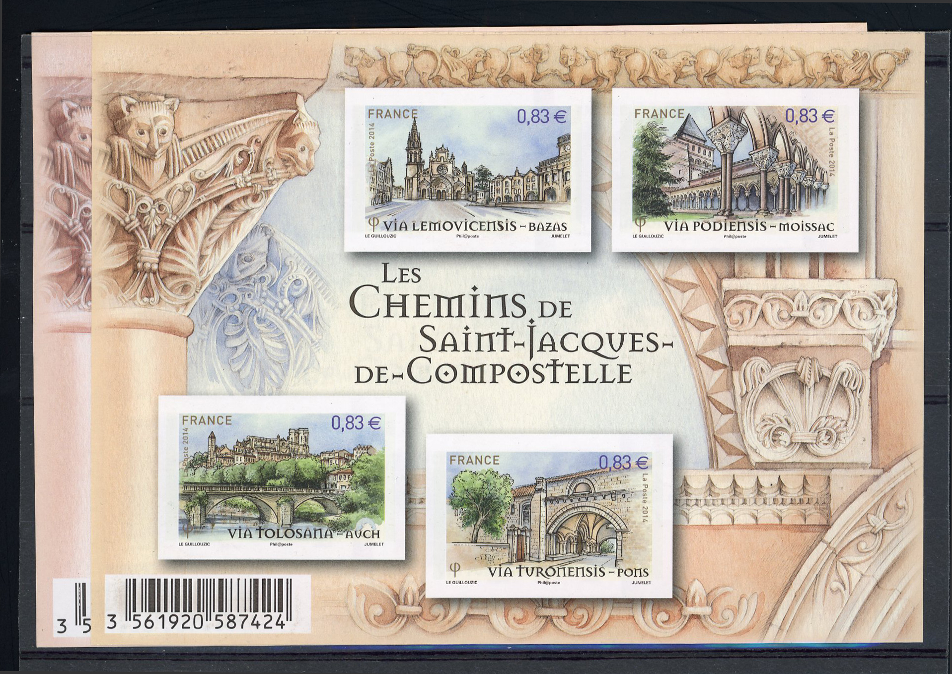 2014, feuillet Compostelle Y&T n° F4838a, deux blocs non dentelés neufs ** MNH dont un bloc avec nuances plus claires, TB. (Image 1)